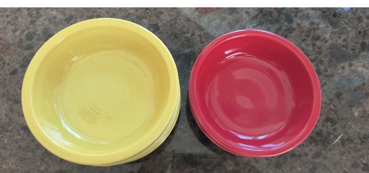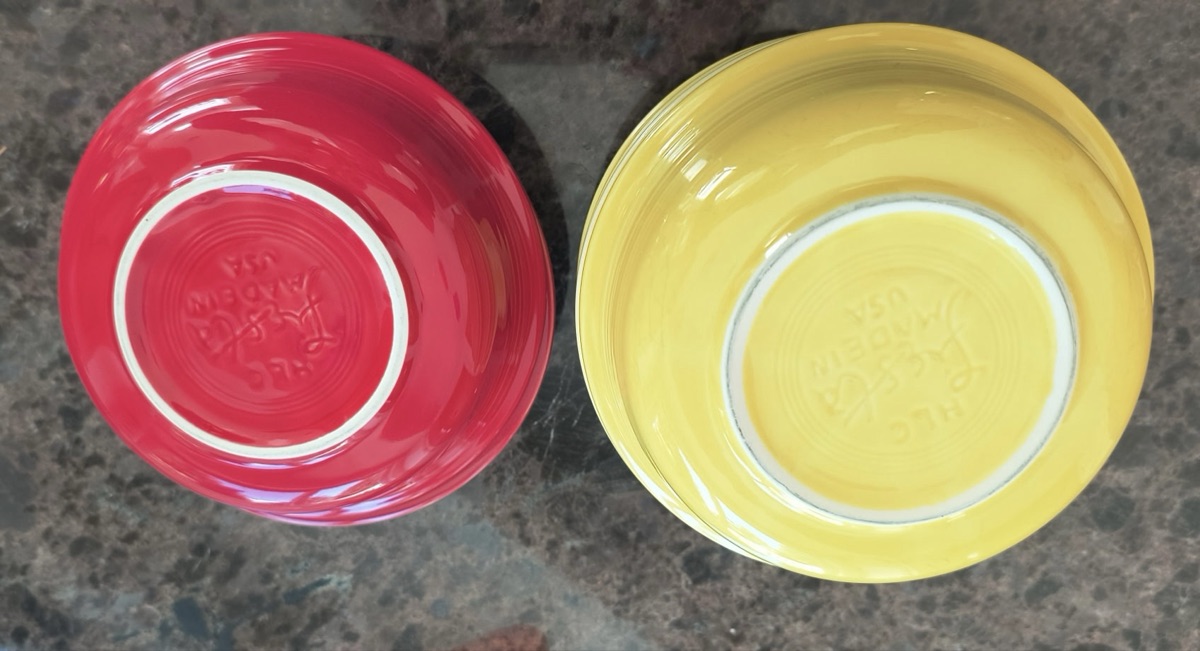 These are iconic American ceramic fruit bowls featuring the signature concentric rings and vibrant lead-free glazes that revitalized the brand in the 1980s.