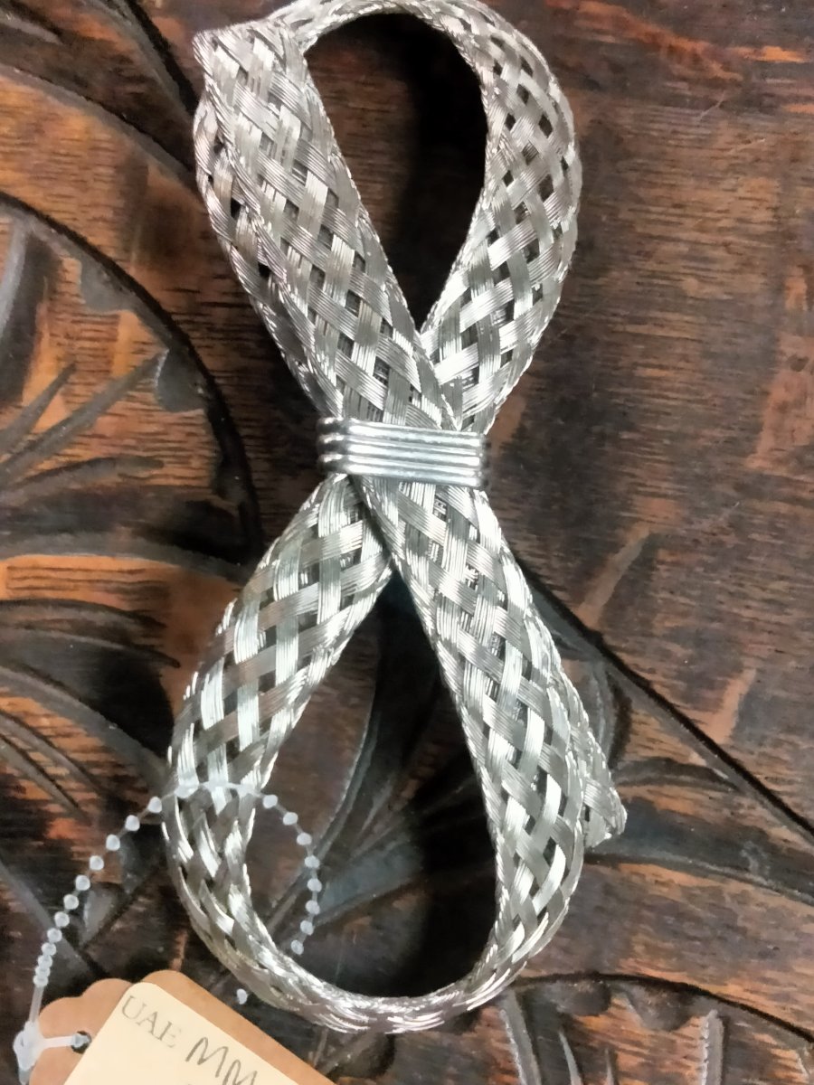 A sophisticated example of French 'bijoux de couture' (fashion jewelry), this piece features a complex, flat-woven metal mesh manipulated into a sculptural figure-eight or bow form.