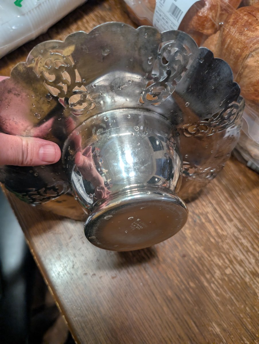 The piece shows significant surface scratching and some 'pitting' or spotting, likely from contact with moisture or acidic fruits. Silverplate values are currently modest as modern lifestyles move away from high-maintenance items, but 'pierced' pieces like this remain popular for vintage wedding…
