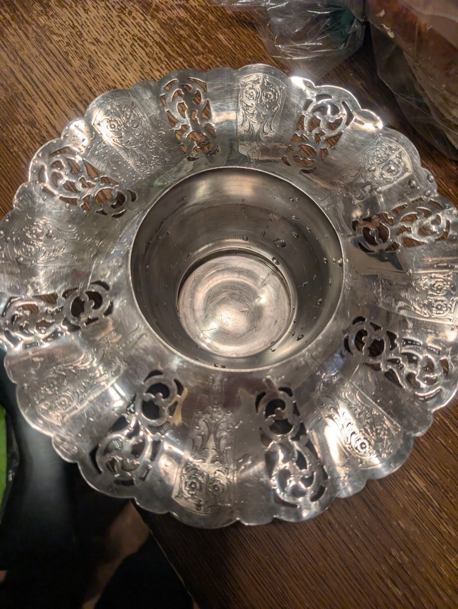 This is a classic American silver-plated compote featuring a dramatic reticulated (pierced) rim with scrolled repoussé motifs.