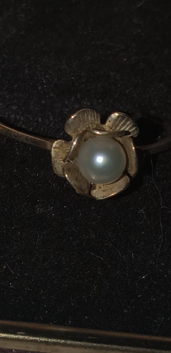 The ring appears to be in very good vintage condition with the pearl retaining a strong, creamy luster and no visible chips. There is light surface wear to the gold band consistent with age, which is expected and does not significantly detract from its value. Excellent preservation of the Florentine texture on the petals.