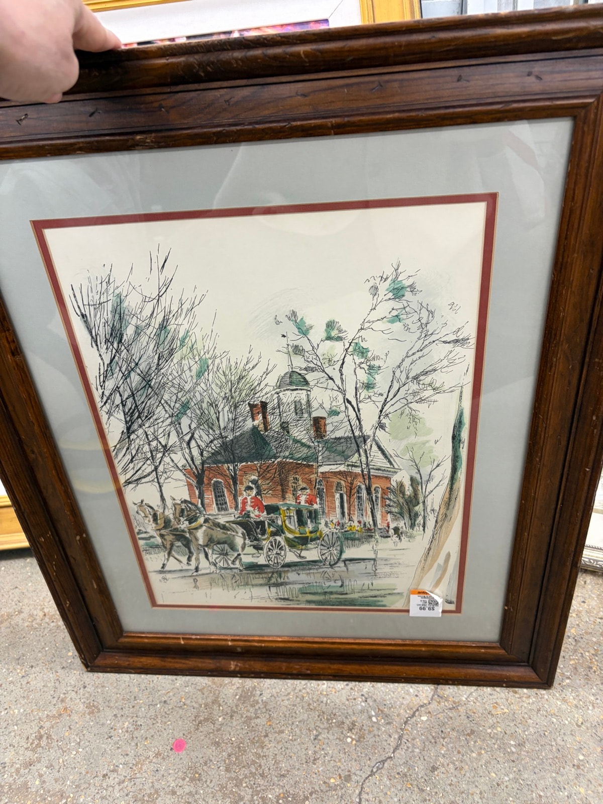 The print appears to be in good condition, protected behind glass, though there is a visible thrift store sticker on the glass itself. Quick ID could not verify a named-artist market here, so this is intentionally priced like decorative/local-sale art.