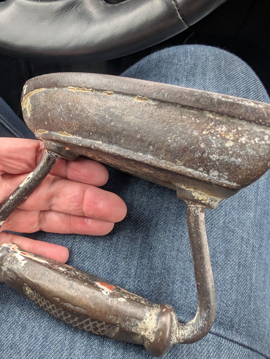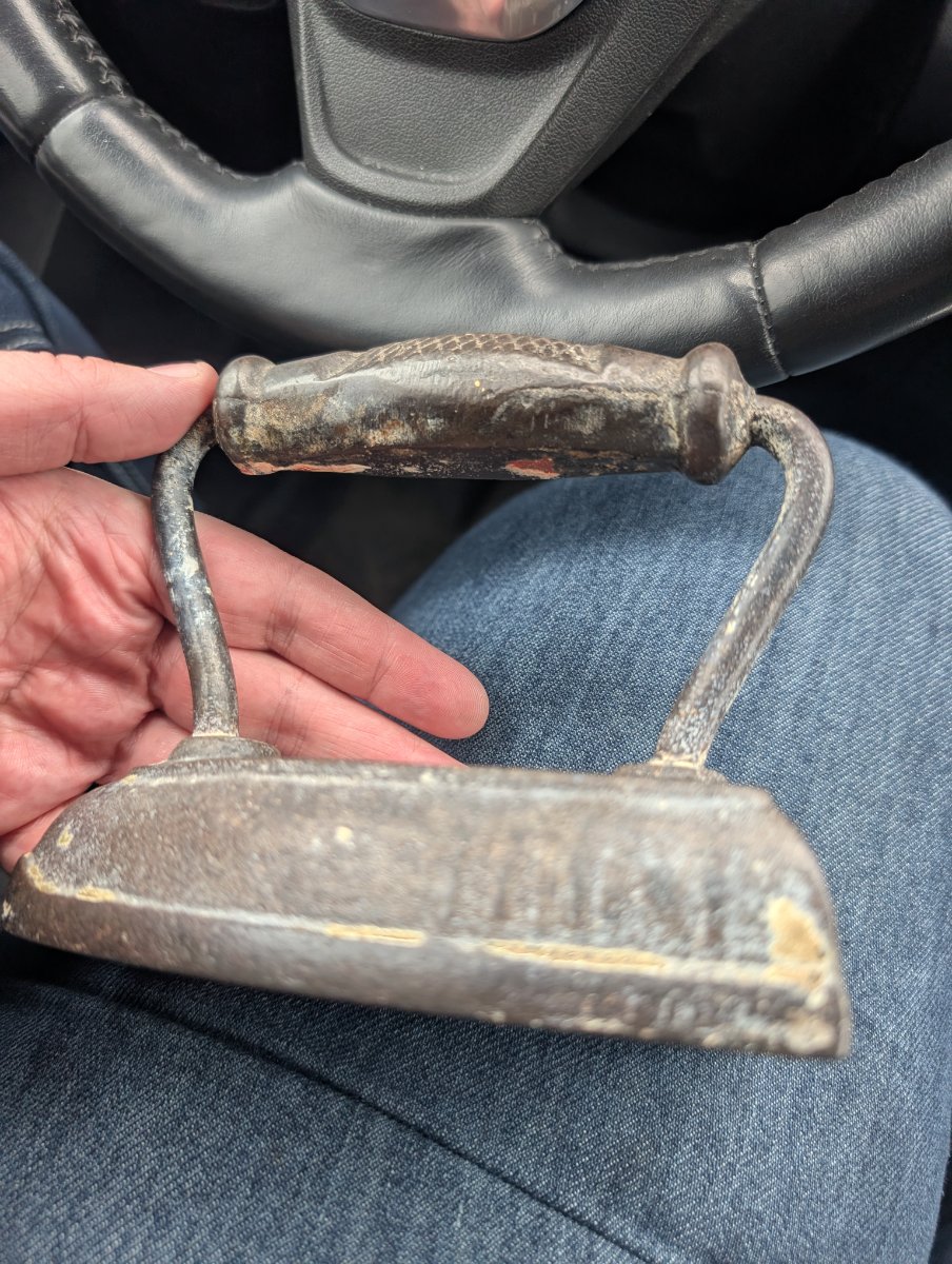 A heavy, solid cast-iron pressing tool used for laundry before the widespread adoption of domestic electricity.