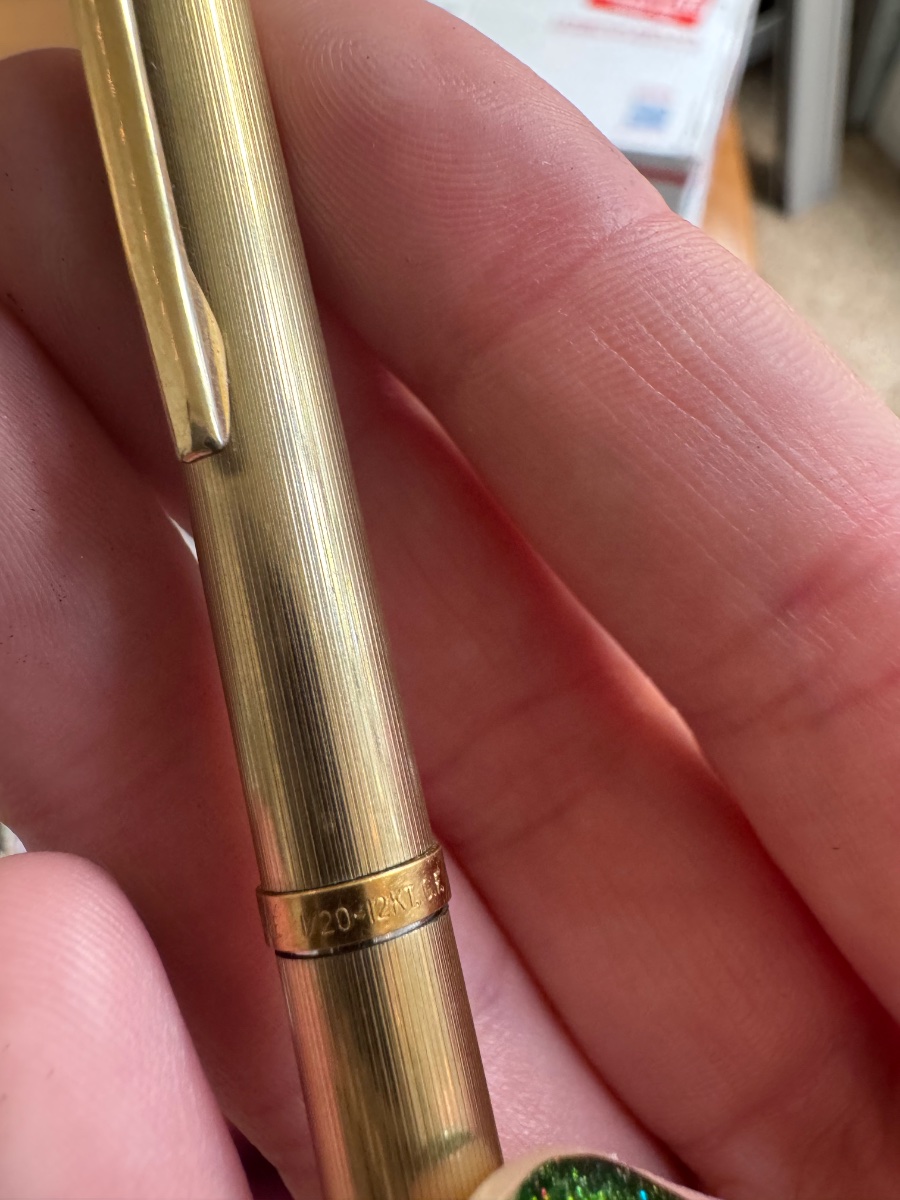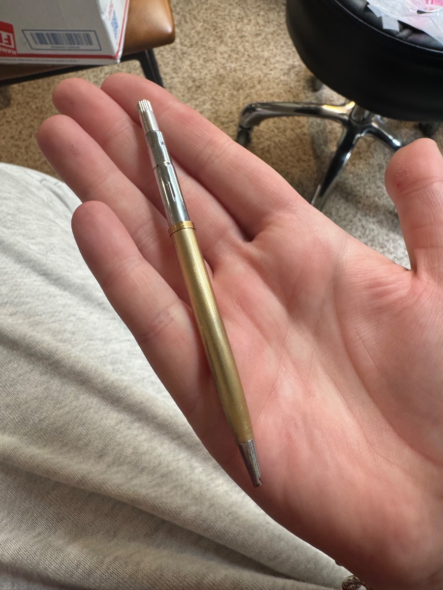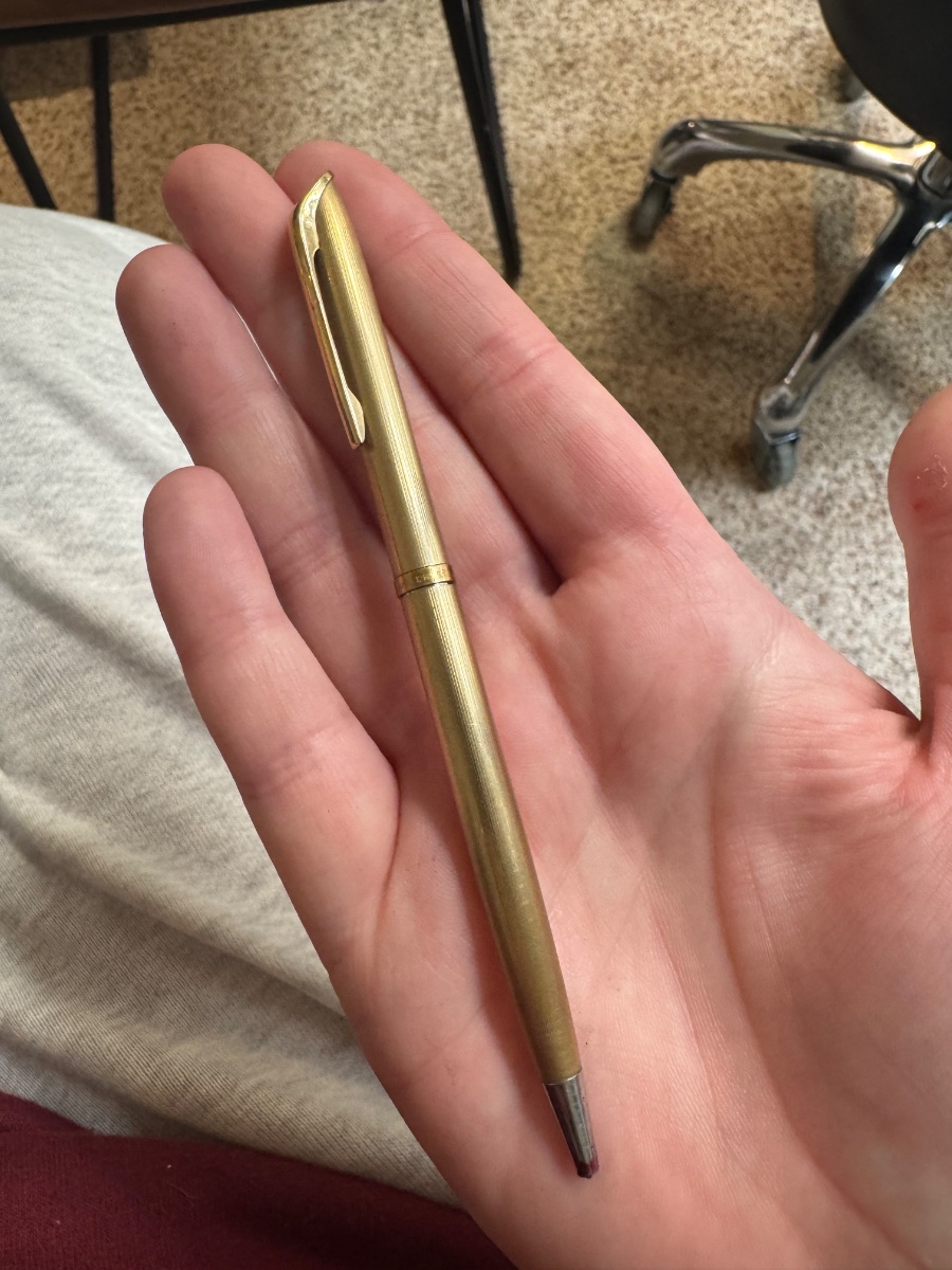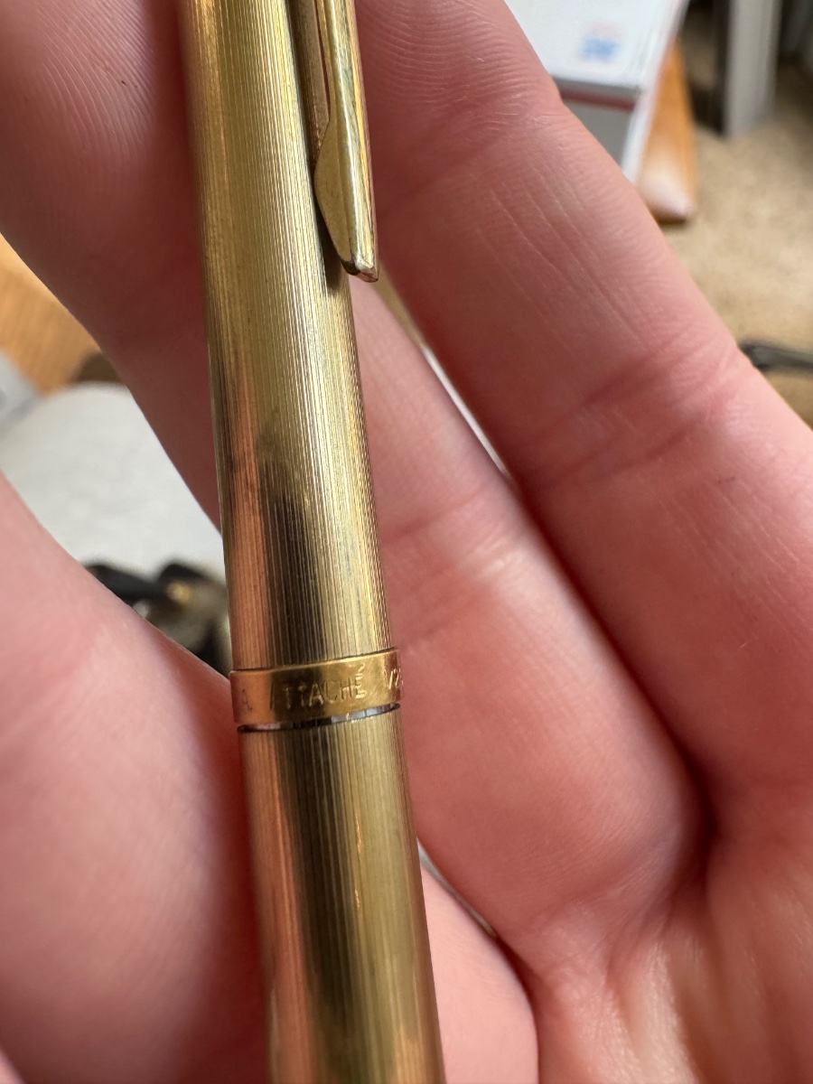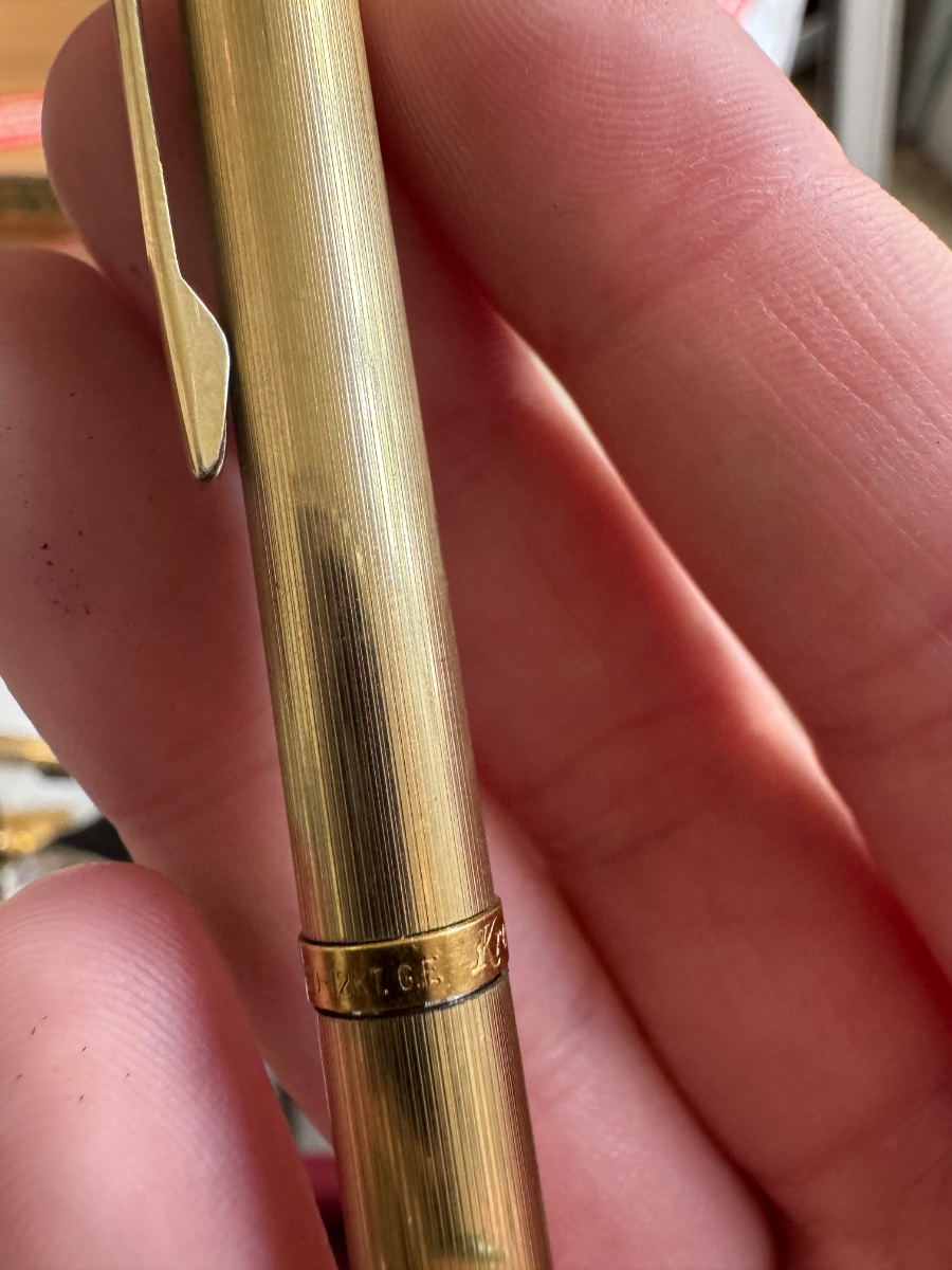 The pencil shows visible 'brassing' or wear to the gold layer, particularly near the tip and the clip, which is common for a piece that was carried daily. Value is driven by the brand name and the gold-filled content.
