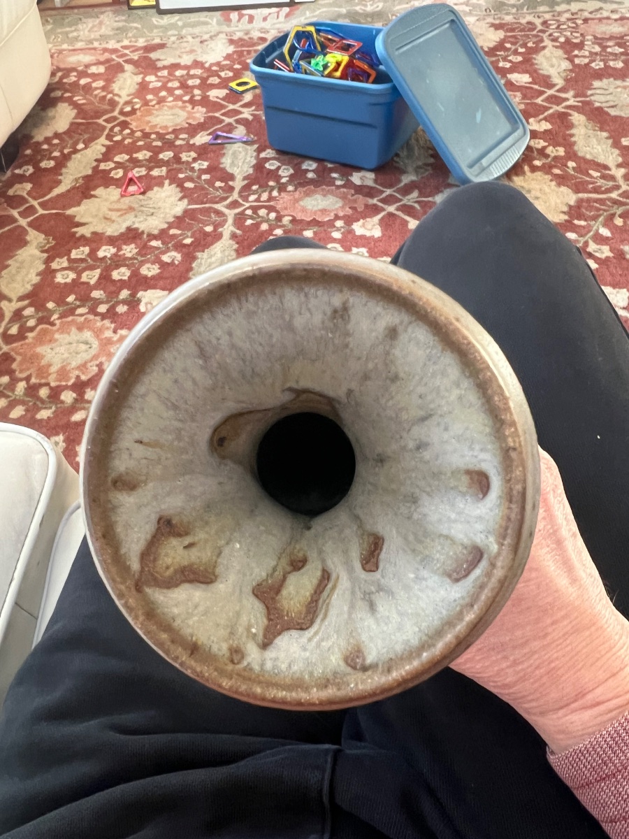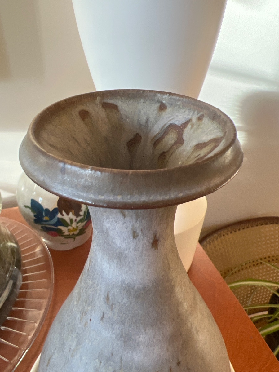 A sophisticated wheel-thrown stoneware vase featuring a dramatic flared rim and a pear-shaped body finished in a mottled reduction-fired glaze.