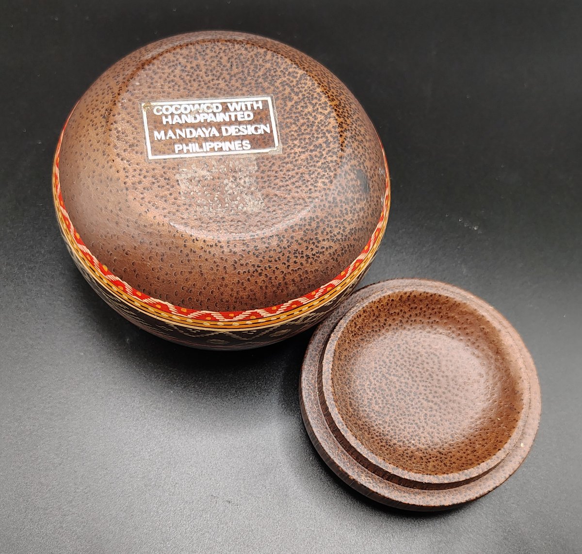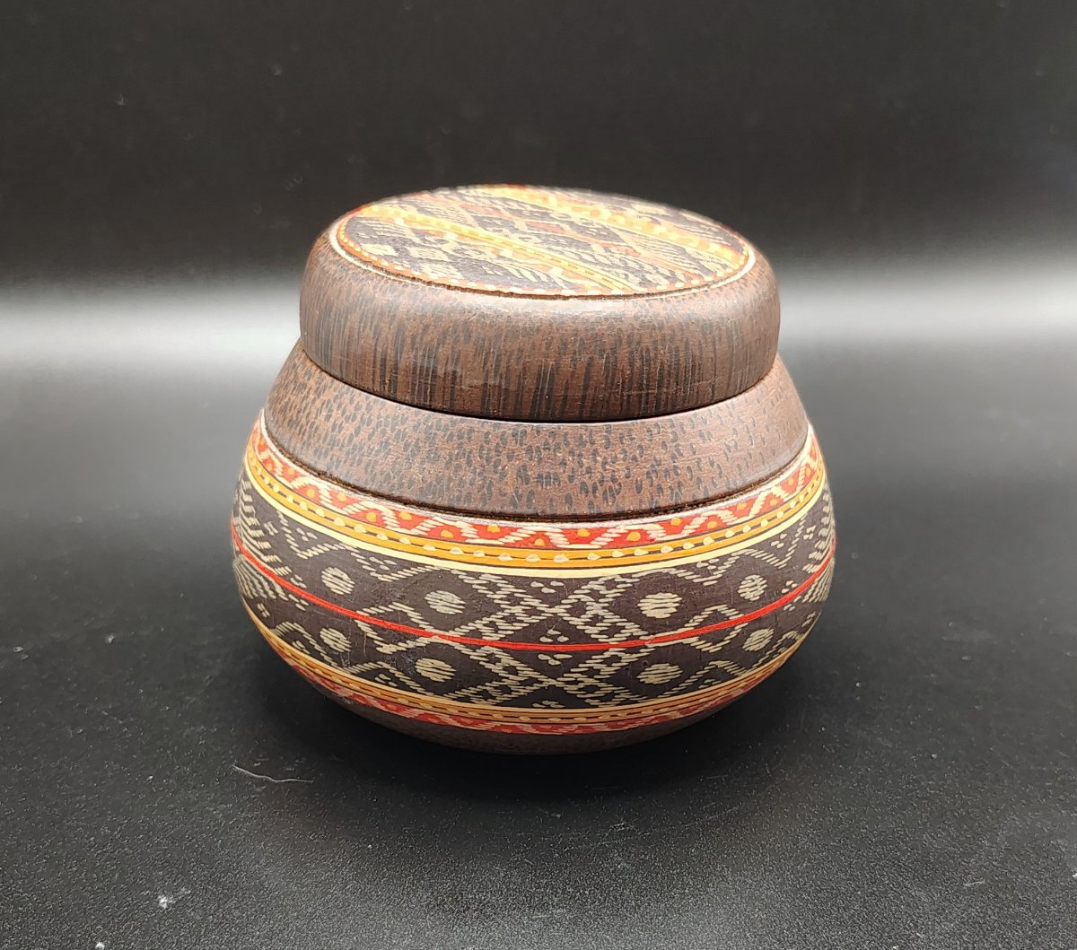 This is a finely turned lidded vessel crafted from the dense, speckled timber of the coconut palm, known as 'the tree of life.' It features meticulous hand-painted geometric motifs that replicate the sacred…