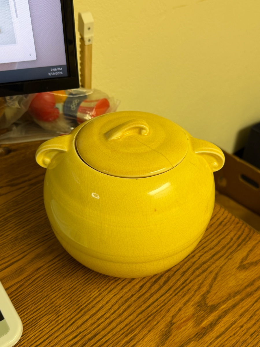 This vibrant yellow vessel is a quintessential example of Bauer's 'Ring Ware,' the line that brought a splash of California sunshine to American kitchens during the Great Depression.