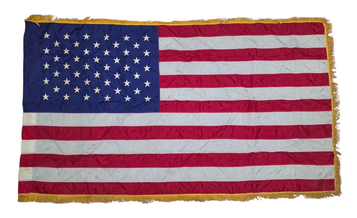A 5ft x 3ft ceremonial United States flag featuring embroidered stars and a gold bullion-style fringe.
