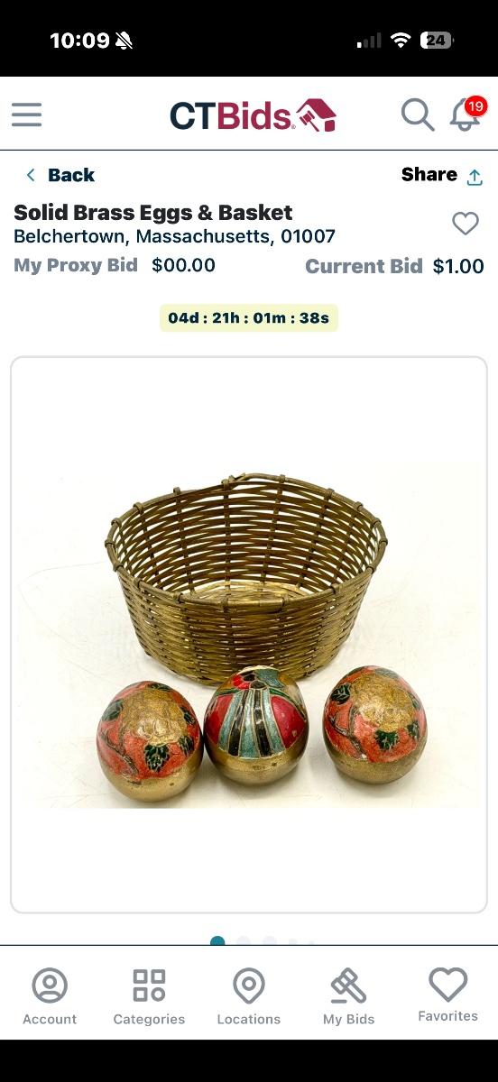 A delightful decorative set featuring three solid brass eggs adorned with hand-applied enamel in floral and geometric patterns, accompanied by a hand-woven brass wire basket.