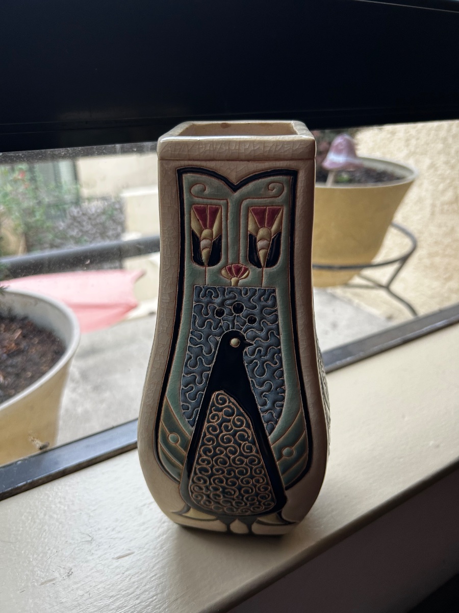 A striking ceramic vase featuring a highly stylized peacock motif executed in the labor-intensive 'tube-lining' technique.