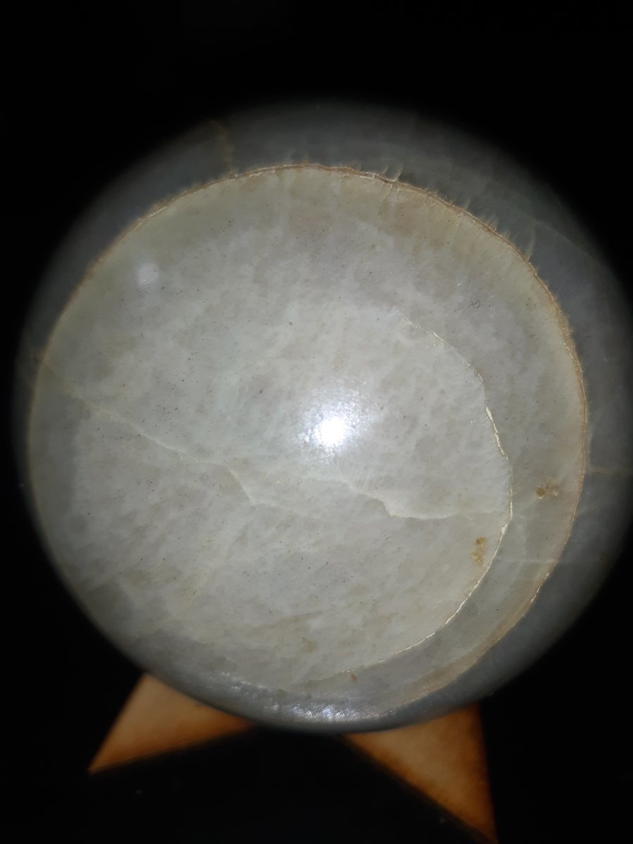 The surface appears to have a high-luster polish with no significant external chips or 'bruises' visible. The internal fractures are natural characteristics of the stone's growth and do not represent damage. The wooden tripod stand is a standard contemporary accessory.