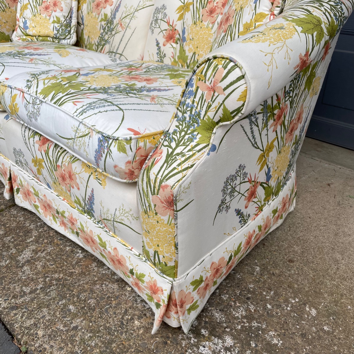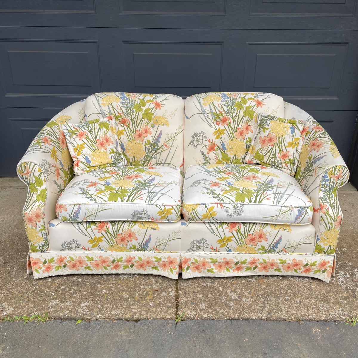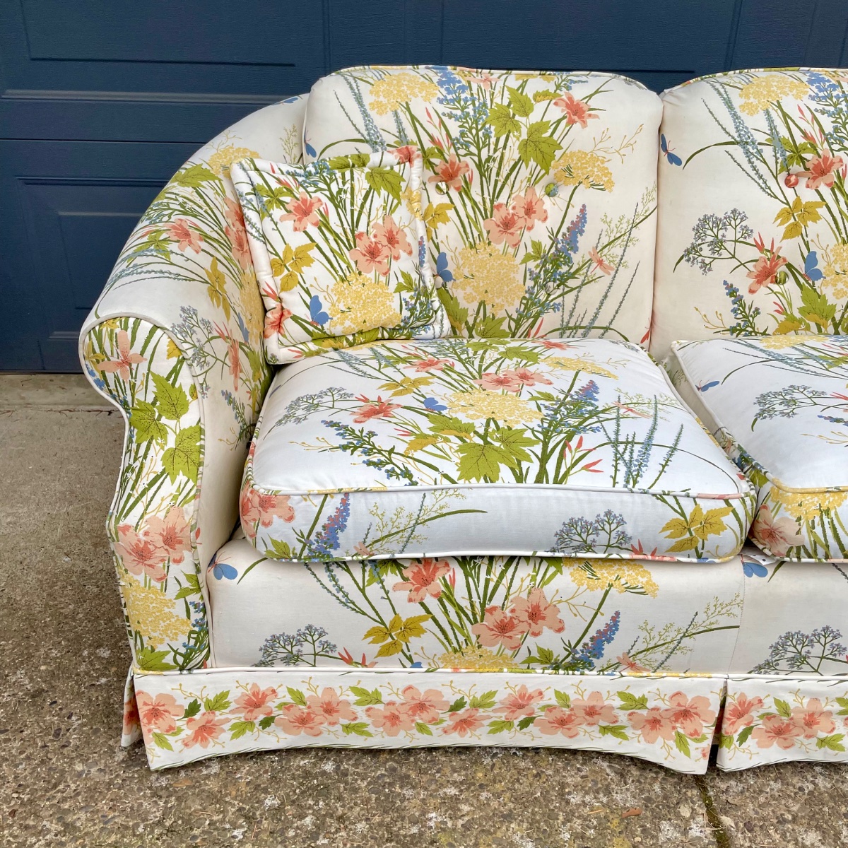 This is a classic rolled-arm loveseat featuring a vibrant, botanical wildflower print that epitomizes the 'American Traditional' aesthetic of the late 20th century.