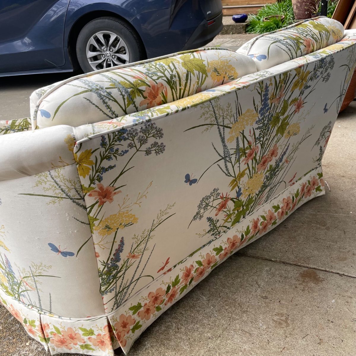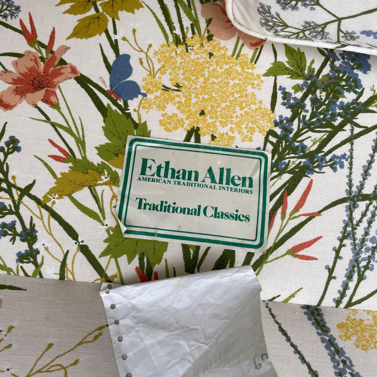 The upholstery appears remarkably vibrant with minimal fading, which is rare for these cotton-based fabrics. Ethan Allen pieces hold their value due to their solid construction, but the recent 'Grandmillennial' design trend has specifically spiked demand for these vintage…