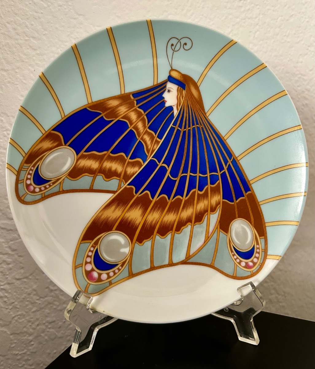 A striking fine porcelain decorative plate featuring the iconic 'Le Papillon' design by the legendary Art Deco master Erté.