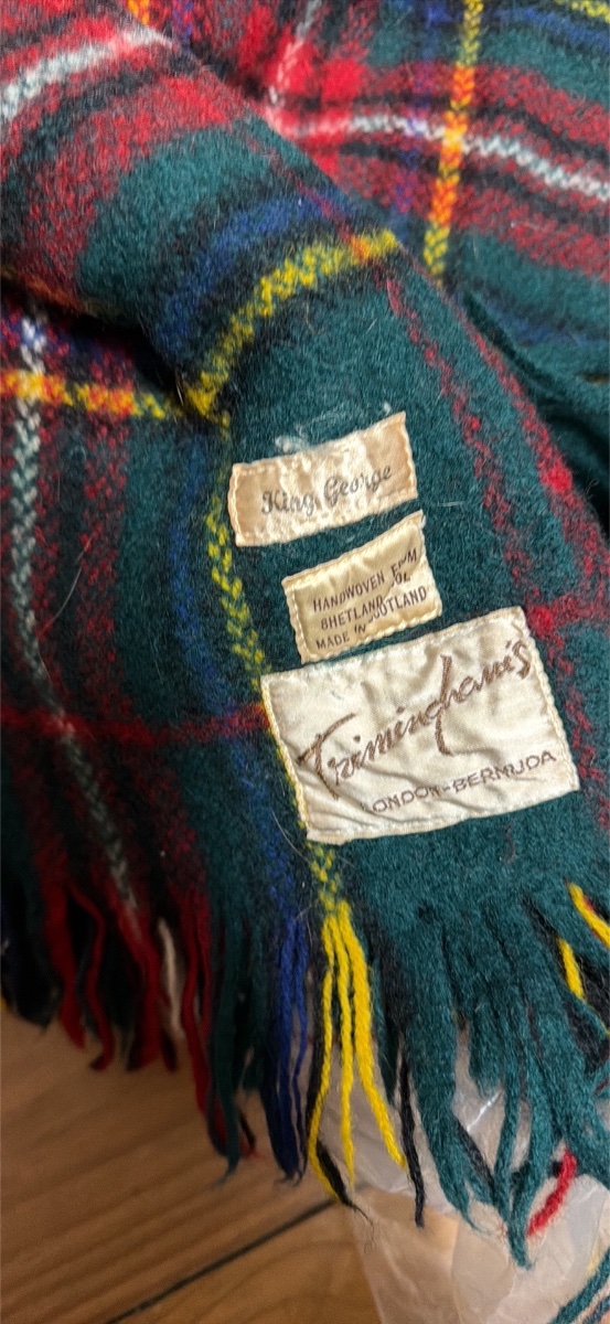 This is a quintessential piece of mid-century luxury travel history, a handwoven Shetland wool throw featuring a vibrant tartan pattern.