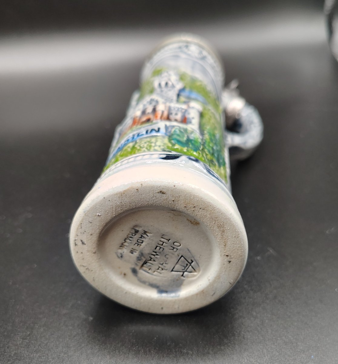 Appears to be in good vintage condition with no visible cracks or chips in the stoneware. The pewter lid shows a nice patina but remains functional. This is a smaller, mass-produced souvenir stein from a reputable maker; while charming and well-made, they are common in the secondary market.