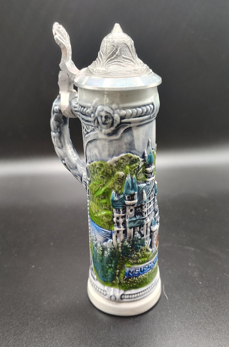 A classic German stoneware stein featuring a high-relief depiction of the fairytale Neuschwanstein Castle.