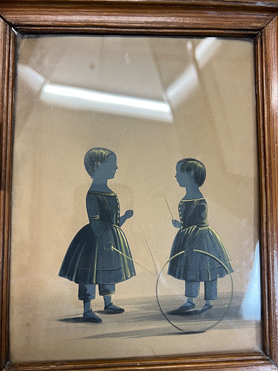 A charming full-length silhouette featuring two children in profile, embellished with delicate 'bronzing' or gold-leaf highlights.