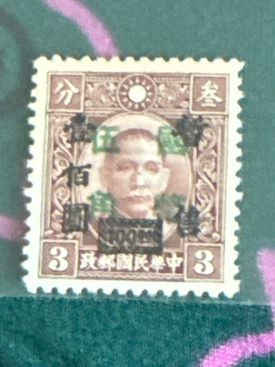 This is a definitive postage stamp featuring Dr. Sun Yat-sen that has been modified with multiple overprints to change its face value.