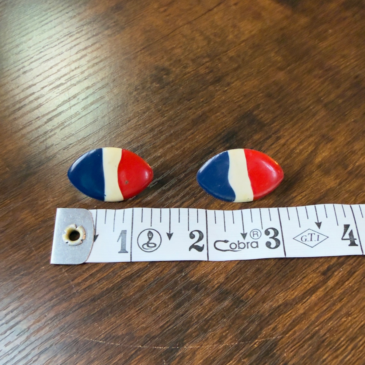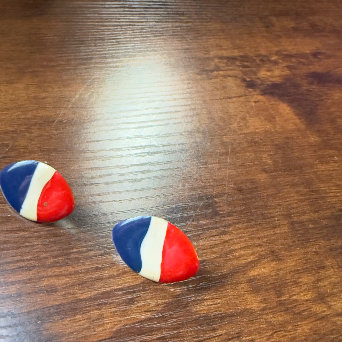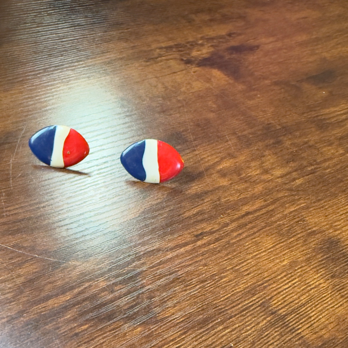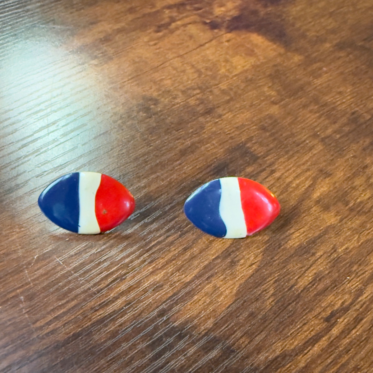 These are bold, graphic post-style earrings featuring a striking red, white, and blue tricolor enamel design.