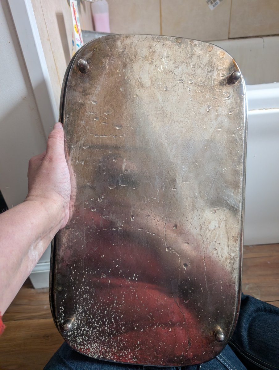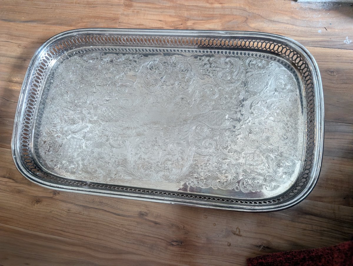 The tray shows significant tarnish and surface oxidation, along with visible 'bleeding' on the underside where the silver plating has worn away to reveal the base metal. While silver-plated items are currently abundant in the market, 'gallery trays' remain the most sought-after form for modern home staging and bar carts.