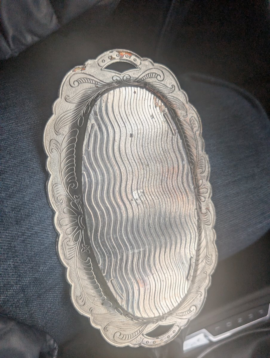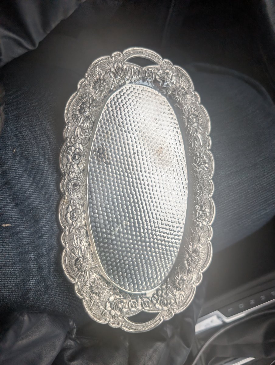 There is visible 'bleeding' where the silver plate has worn away to reveal the base metal underneath, particularly on the edges and handles. Value is driven by the decorative appeal and the condition of the silver plating. While these are common collectibles, they remain popular for vintage-themed decor.