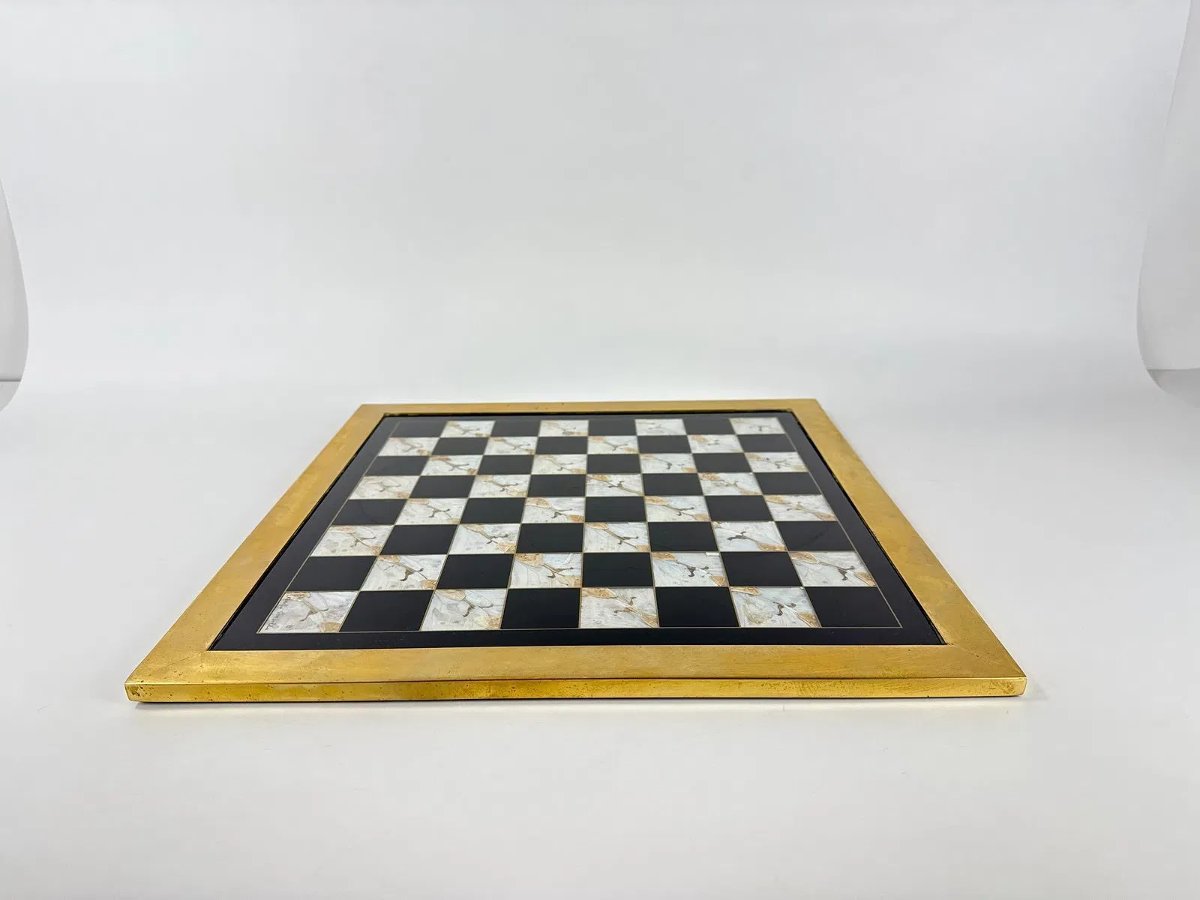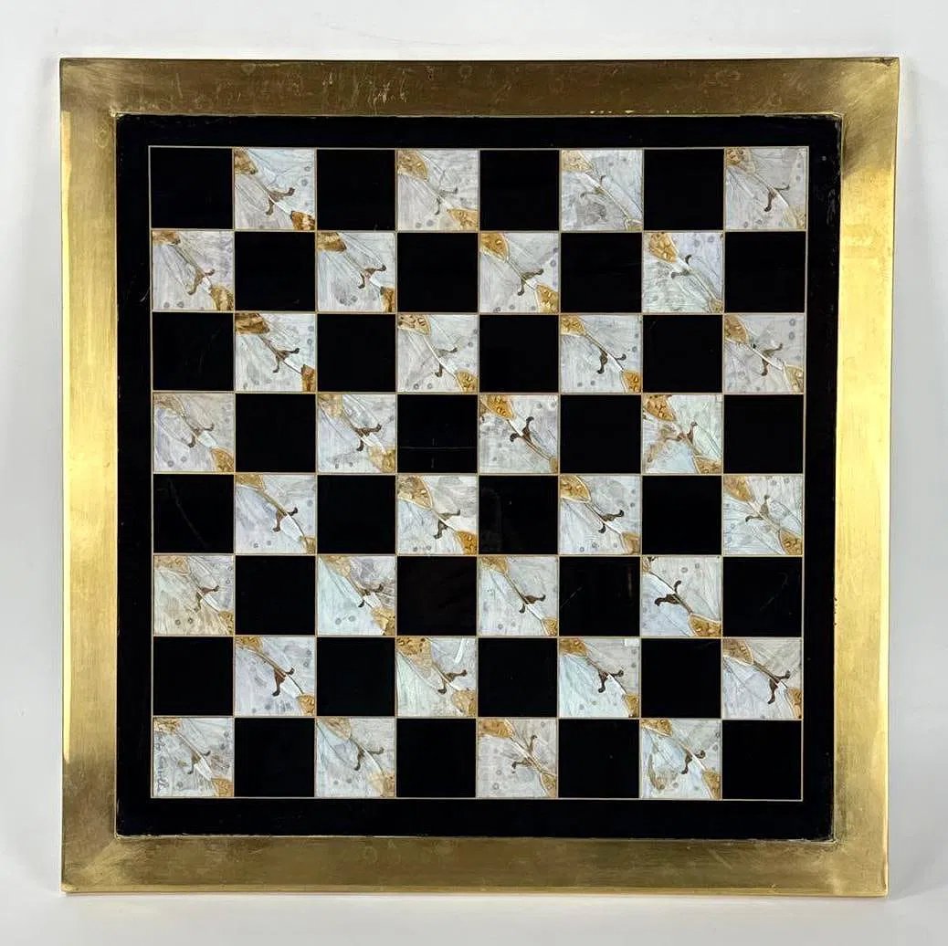 A striking decorative game board featuring genuine iridescent butterfly wings meticulously arranged under glass to form the light squares.