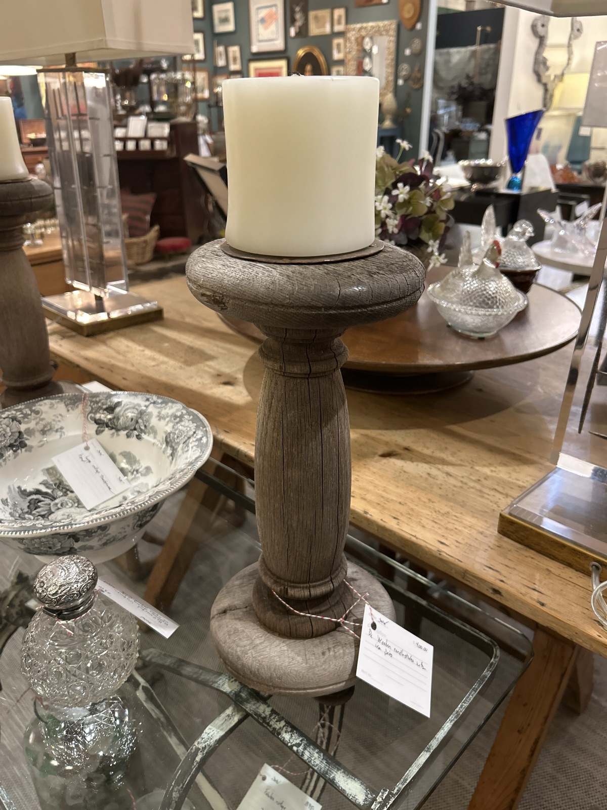 These are substantial, hand-turned wooden candlesticks featuring a classic baluster form and topped with hand-forged iron drip pans.
