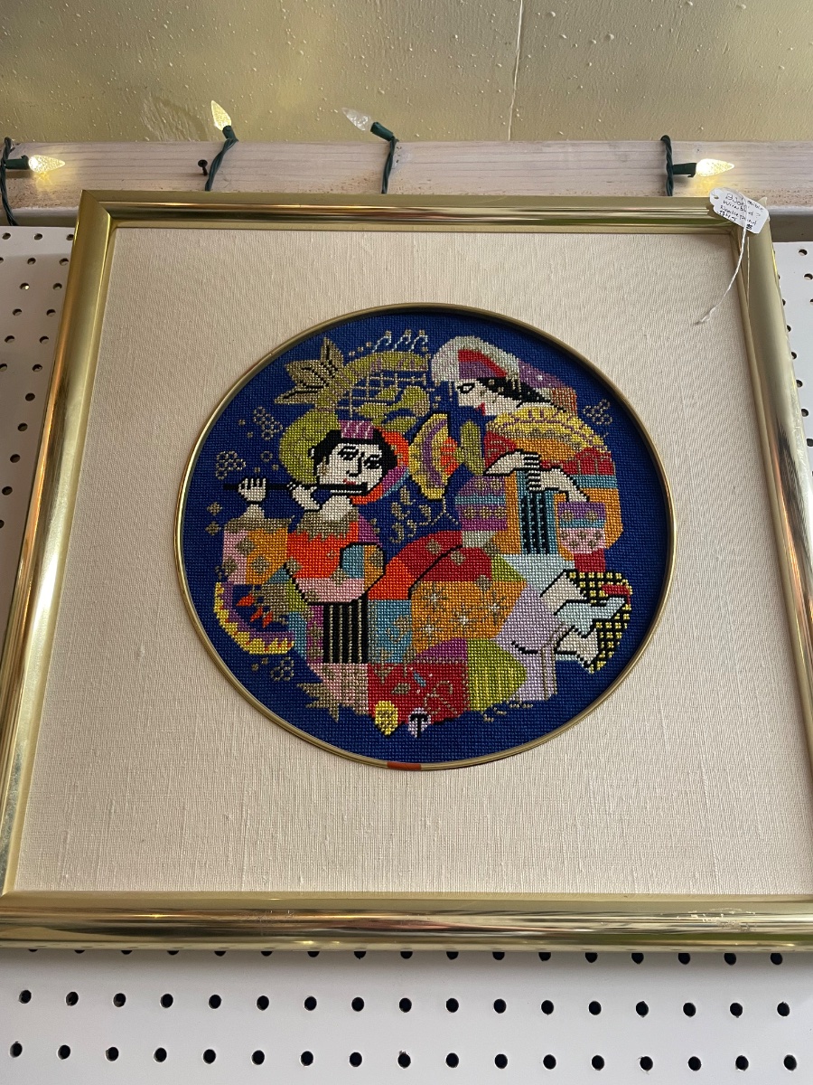 The needlepoint appears exceptionally well-preserved with vibrant colors and no visible fading or 'bleeding' of dyes. While the tag shows a thrift price of $34, Wiinblad's market has seen a significant resurgence.