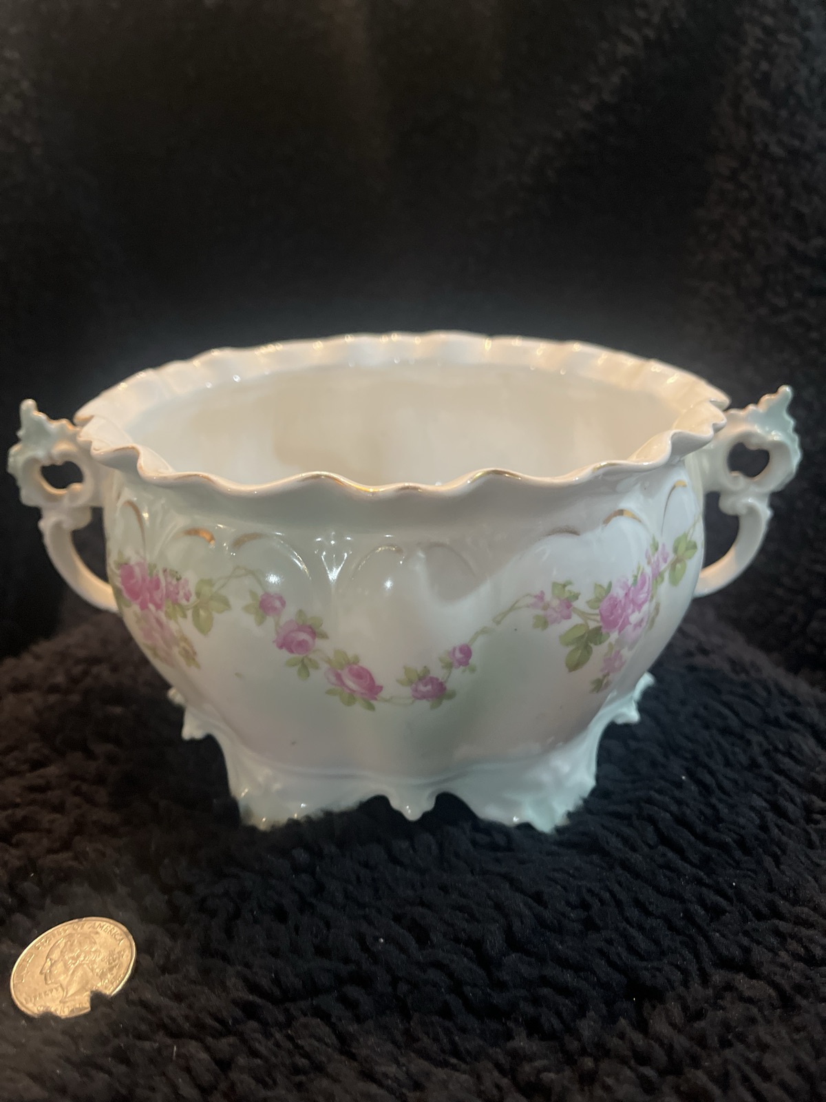 A fine example of Austrian hard-paste porcelain featuring a scalloped 'pie-crust' rim, ornate scrolled handles, and delicate pink rose garlands.