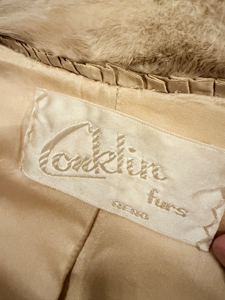 The fur appears supple and the lining remains intact, though there is minor wear visible on the edges of the woven label. While original retail was thousands of dollars, the secondary market for vintage fur is currently conservative.