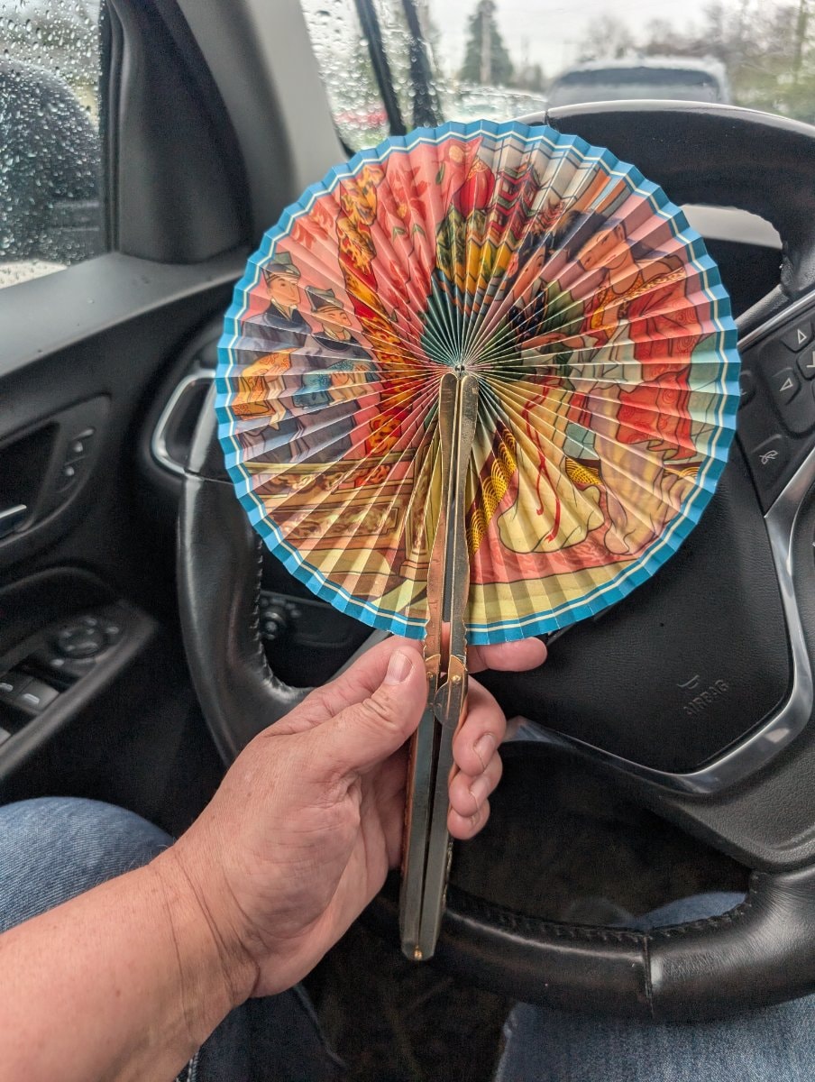 While no specific maker is marked, these fans were staple export items from post-war Japan and Hong Kong during the mid-century 'Orientalia' craze.