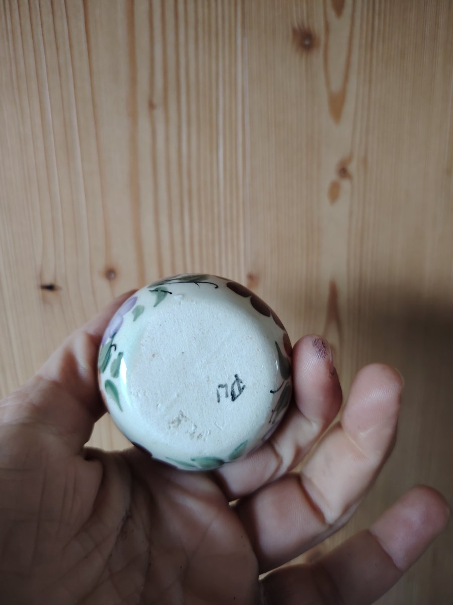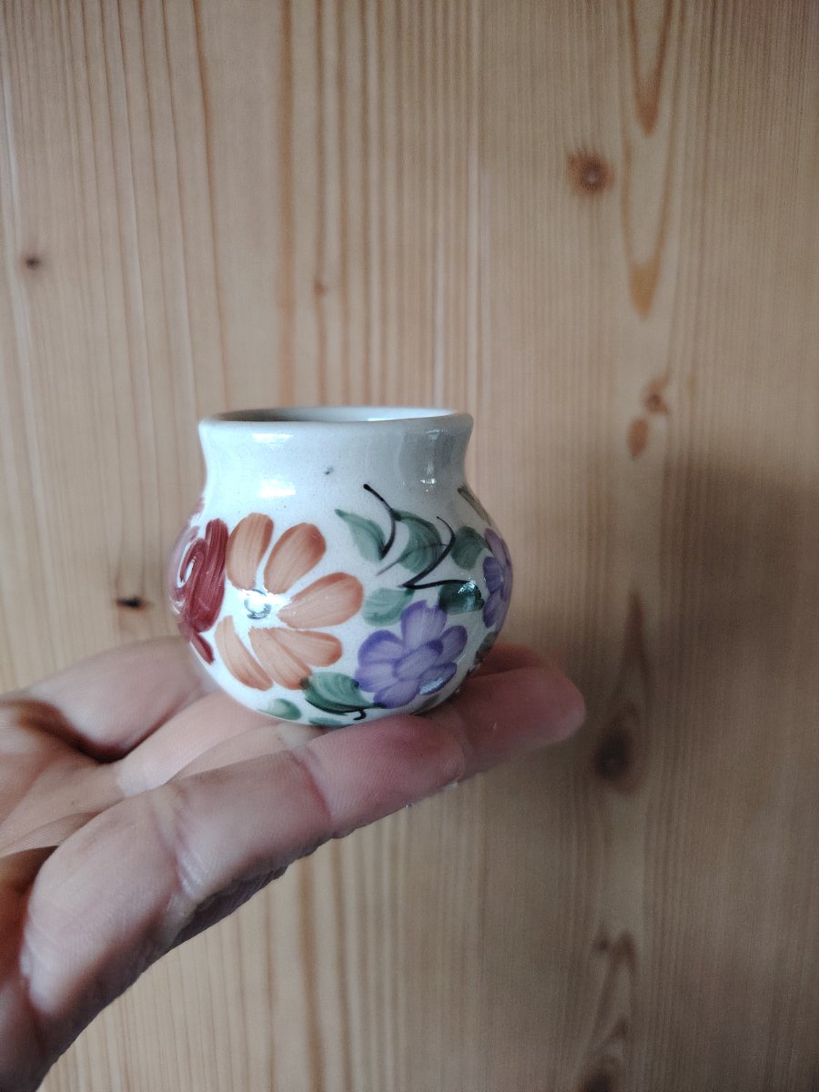 A charming miniature earthenware vessel featuring vibrant, hand-painted polychrome floral motifs on a tin-glazed white ground.