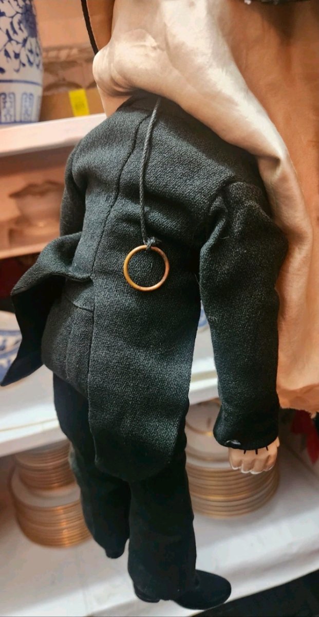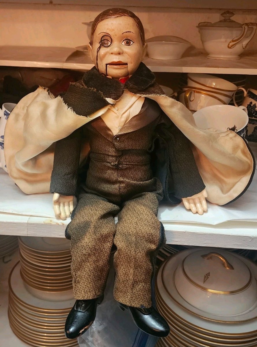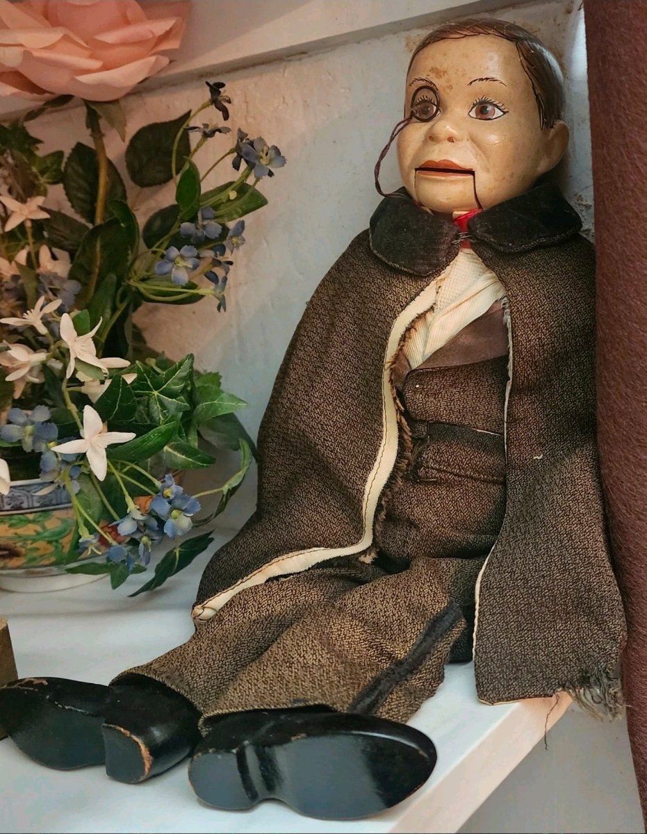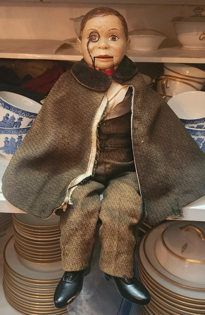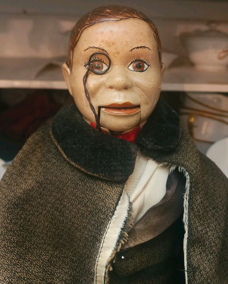 This is a classic composition-head ventriloquist dummy modeled after Edgar Bergen's legendary sidekick, Charlie McCarthy.