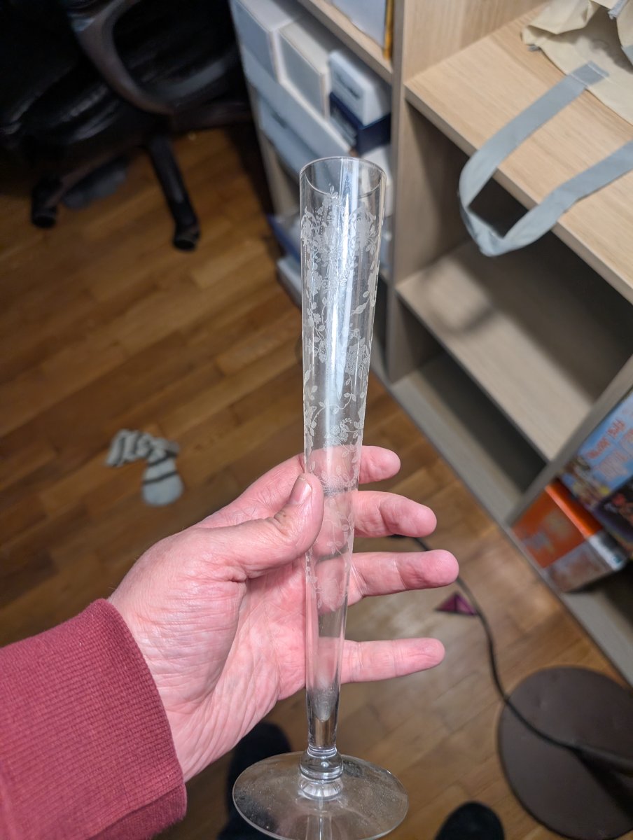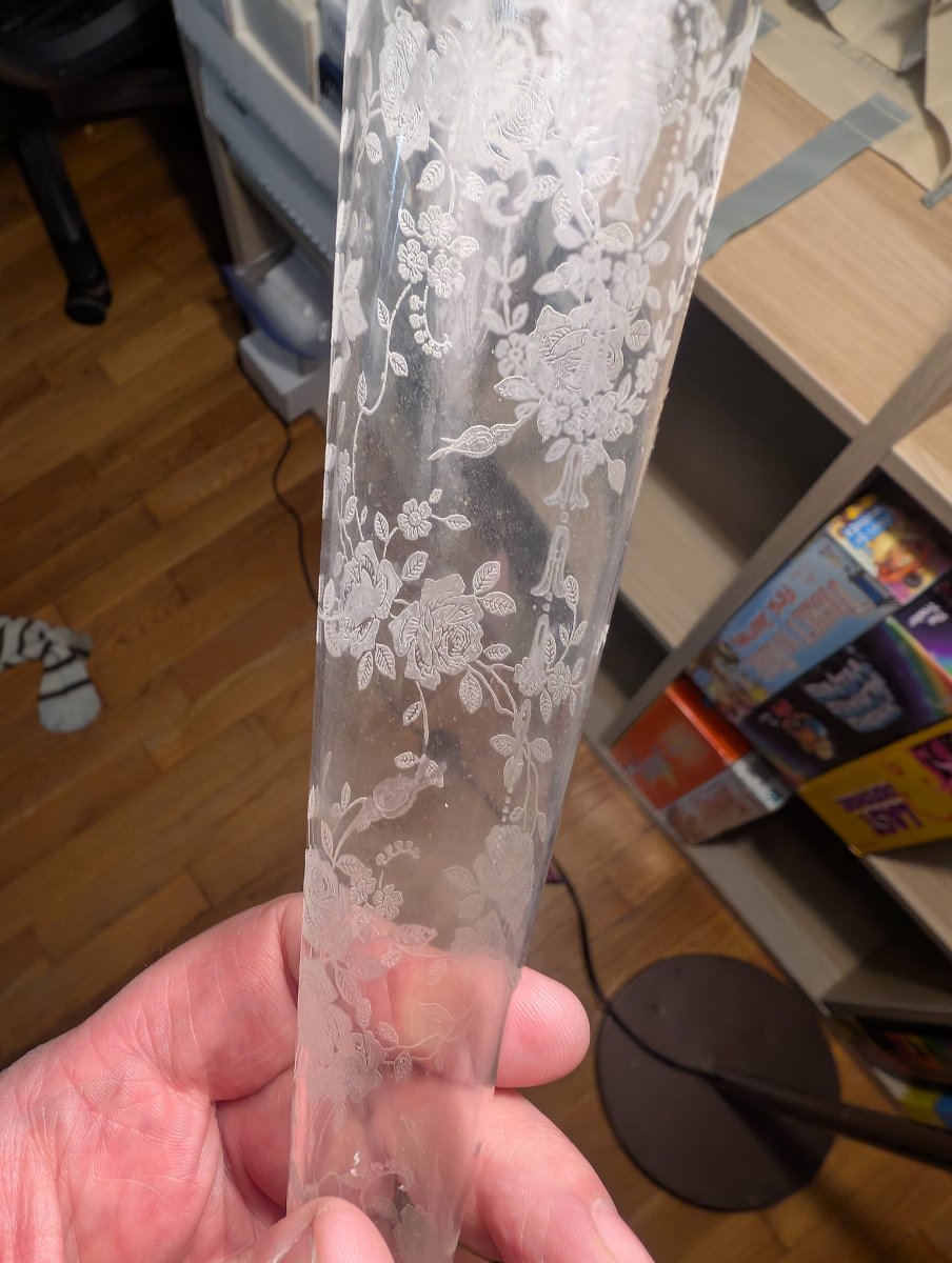 A slender, hand-finished 'Elegant Glass' bud vase featuring a delicate needle-etched floral and swag motif.