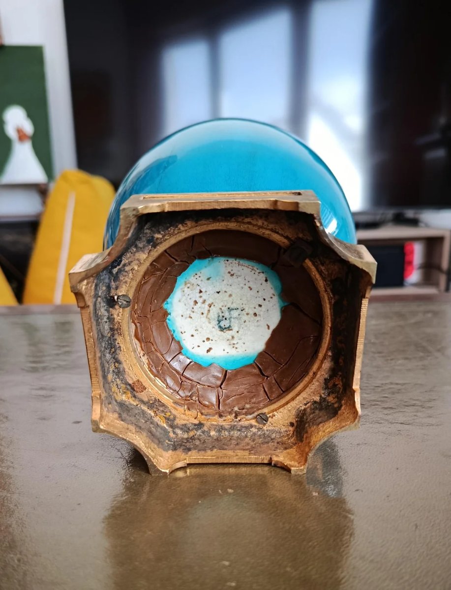 The metal shows authentic oxidation and some verdigris, which is consistent with its age. Value is driven by the vibrant color and the presence of the original metal mount.