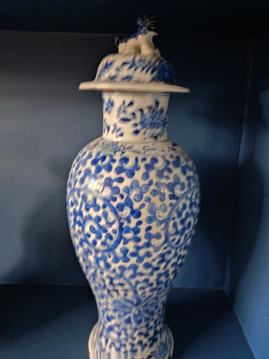 A classic baluster-form porcelain vase featuring the 'cracked ice and plum blossom' motif, complete with its original lid topped by a hand-molded guardian lion finial.