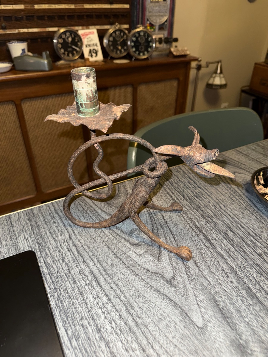 A remarkable example of decorative blacksmithing, this candlestick features a whimsical, hand-wrought creature—part dragon, part hound—whose coiled tail provides the structural support for a candle cup.
