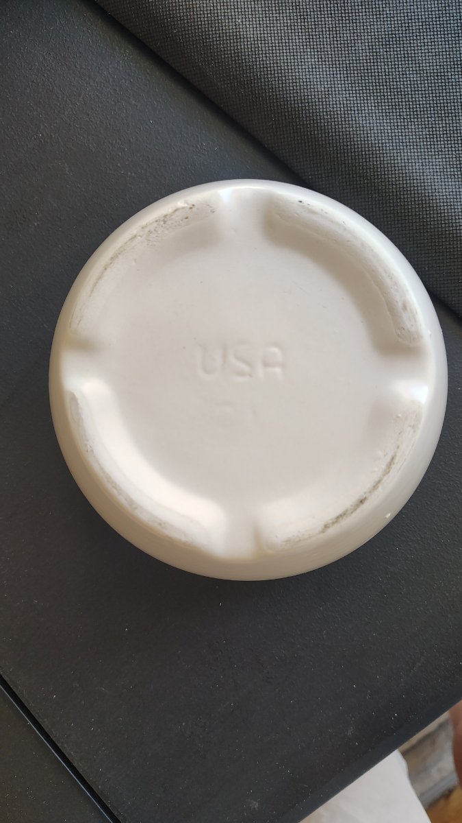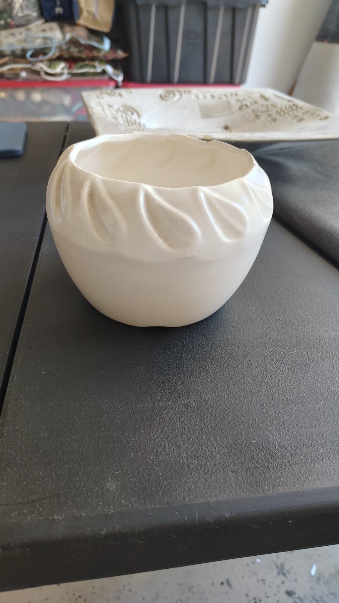 A classic piece of American 'florist ware' featuring a soft satin-matte glaze and a rhythmic, embossed swirl pattern around the rim.