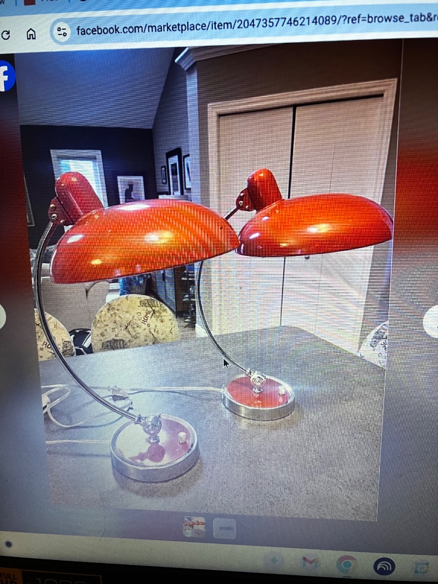 A striking pair of task lamps featuring a bold 'C' shaped chrome armature and vibrant red domed shades. These pieces capture the sleek, aerodynamic 'Space Age' aesthetic that defined mid-century office decor…