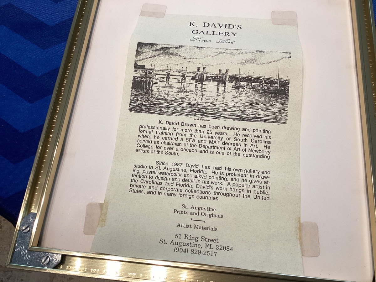 This piece represents the work of K. David Brown, a classically trained artist and former academic who became a staple of the St. Augustine art scene.