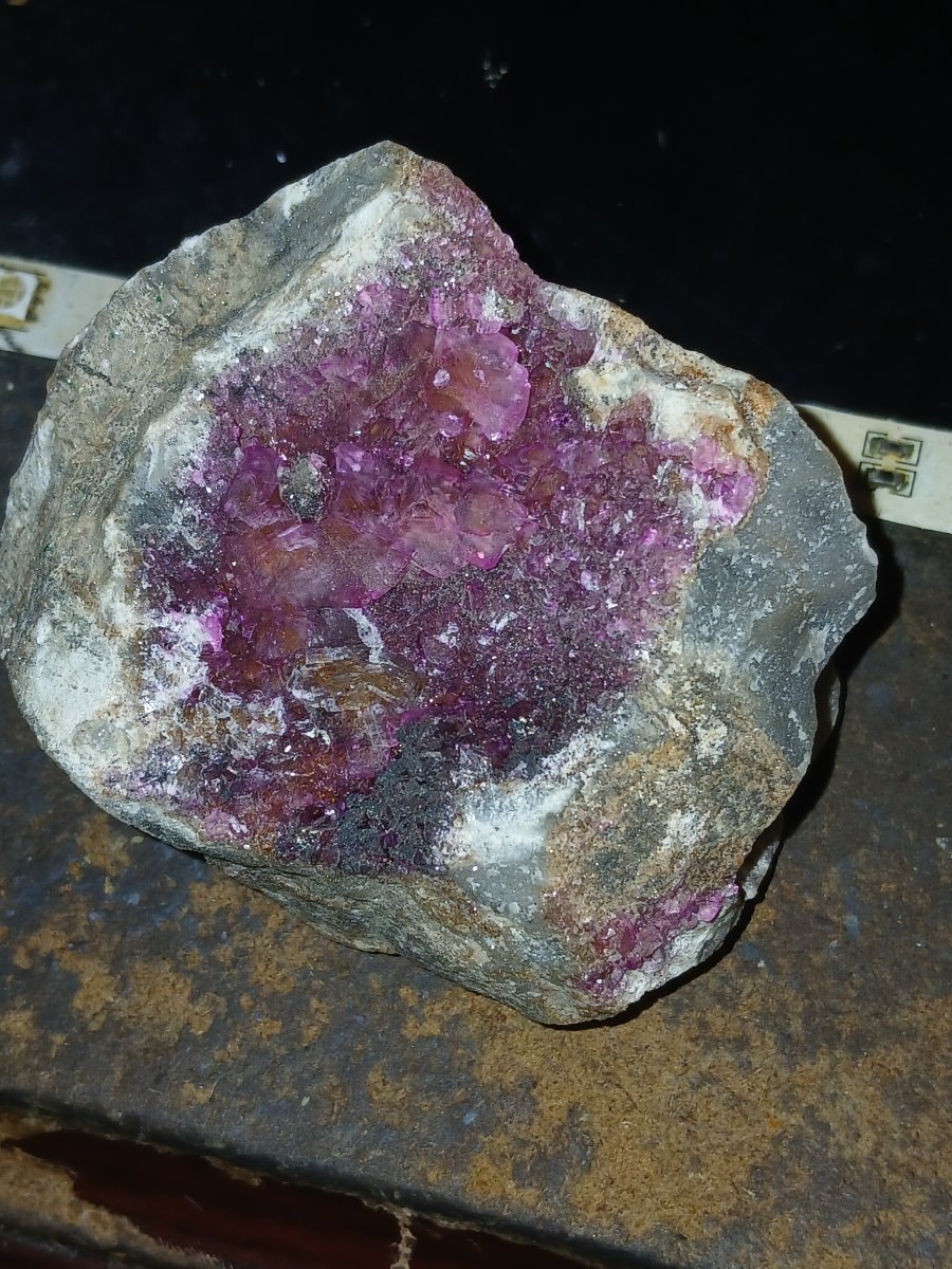 A natural rock matrix featuring a vug (cavity) filled with vibrant, druzy magenta Cobaltoan Calcite crystals. This specimen showcases the rare occurrence where cobalt replaces calcium in the crystal lattice…