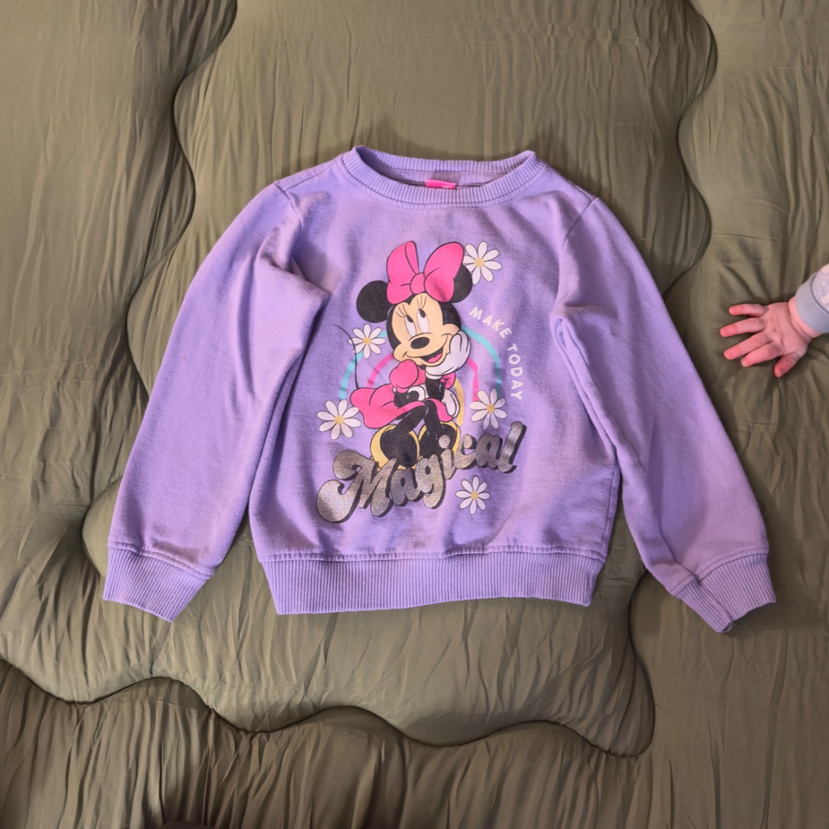 A vibrant lavender-colored fleece sweatshirt featuring a screen-printed graphic of Minnie Mouse surrounded by daisies and a rainbow.