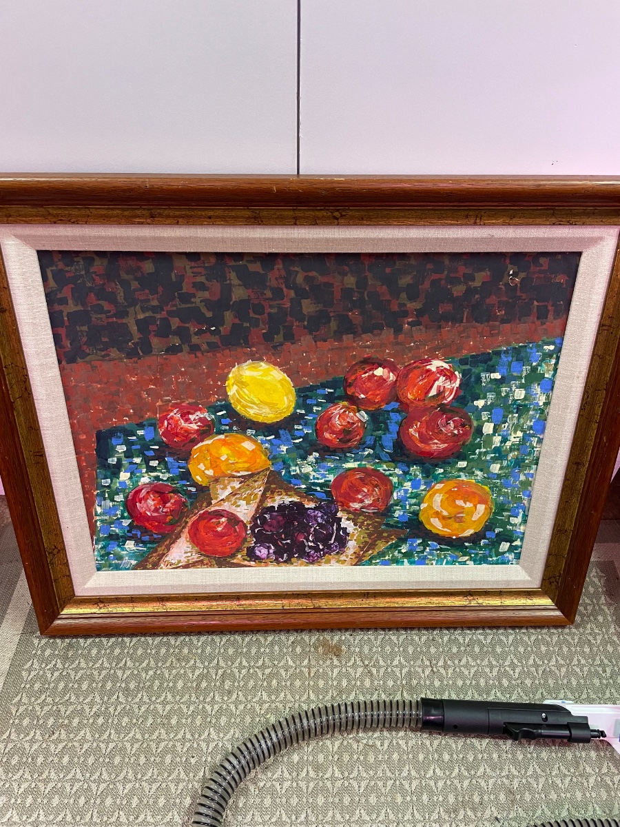 The painting shows significant signs of age, specifically 'flaking' or paint loss in the upper right background and on several of the red fruits. The value is driven by the strong mid-century aesthetic and the quality of the composition.