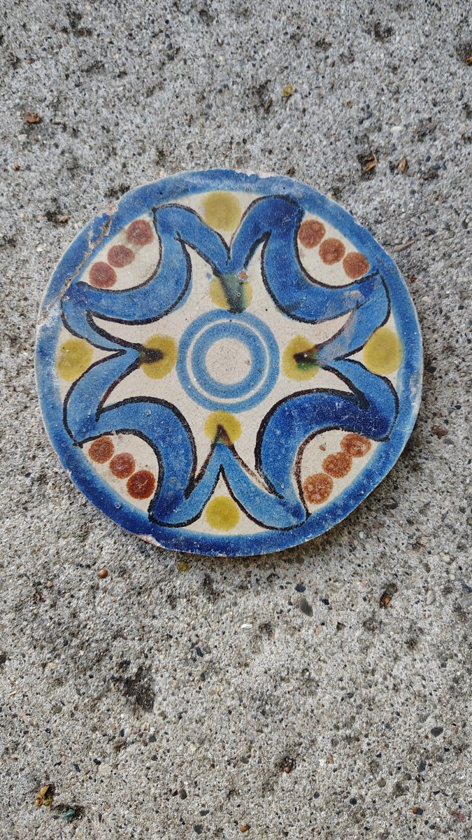 A hand-painted tin-glazed earthenware (maiolica) tile featuring a classic Moorish-influenced geometric star pattern in cobalt blue, ochre, and manganese.