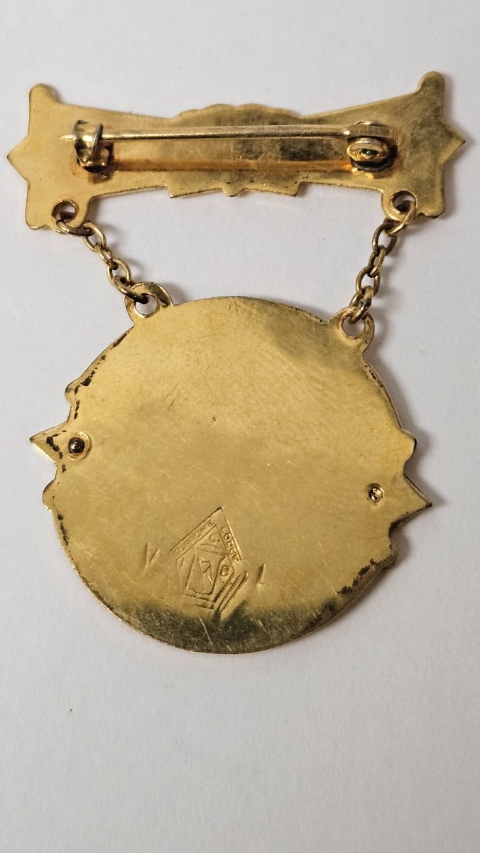The medal is in good vintage condition with the enamel on the shield appearing remarkably well-preserved. There is visible surface wear and light scratching on the reverse, consistent with being pinned to a uniform or suit jacket for many years. The original pin mechanism is intact, which is vital for value.