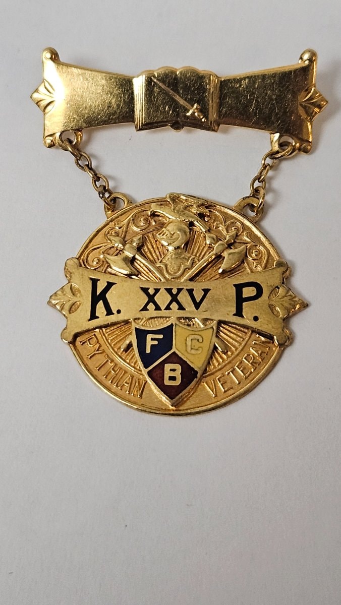 A two-piece fraternal service medal featuring a top bar shaped like an open book with a sword, suspending a circular medallion with the 'F C B' shield.
