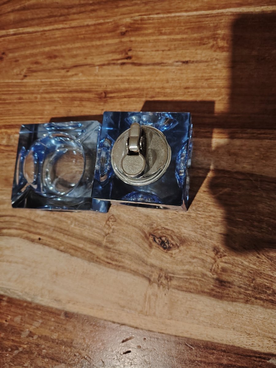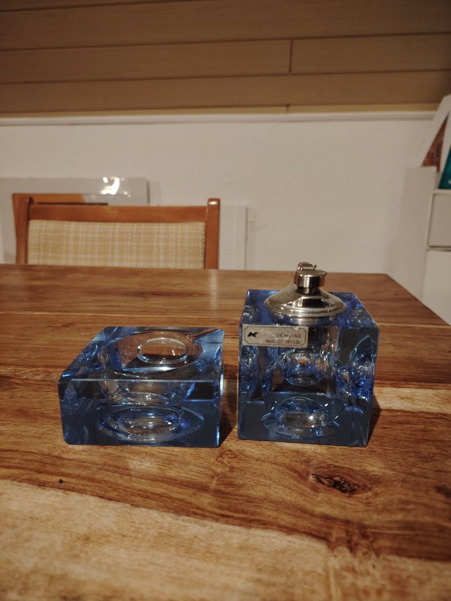 A stunning two-piece smoking set crafted from heavy, cerulean blue lead crystal with deep, hand-cut 'thumbprint' facets.