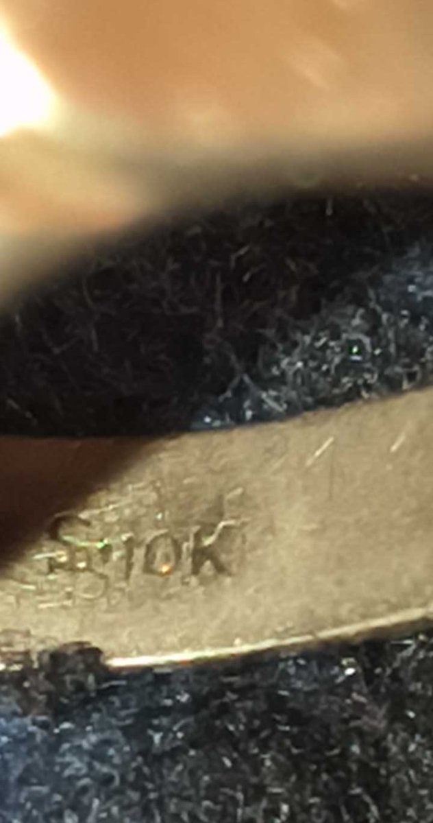 The ring shows honest wear consistent with daily use, with some softening of the gold's edges and surface micro-scratching. The crest remains firmly attached to the stone, and the '10K' hallmark is clearly legible. This level of wear is expected and actually confirms the piece's history as a worn memento.