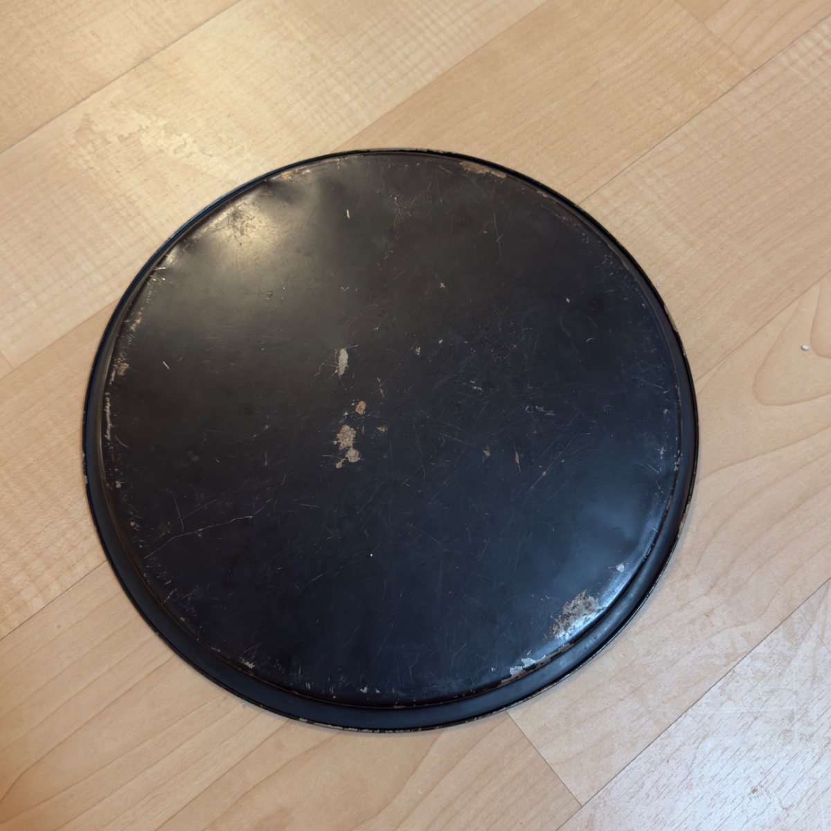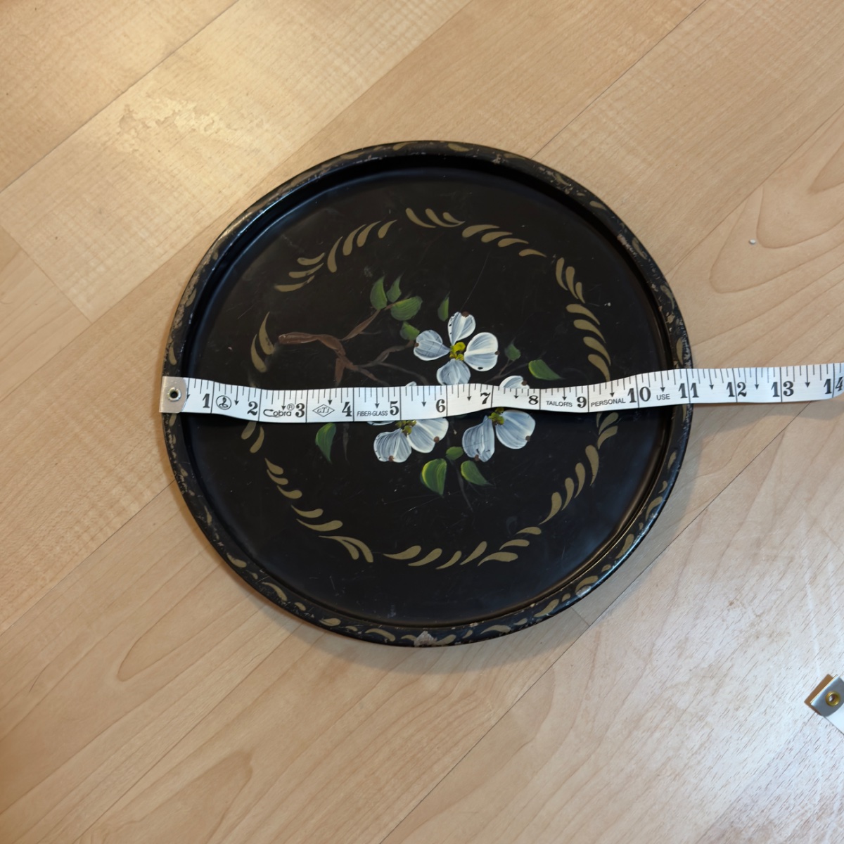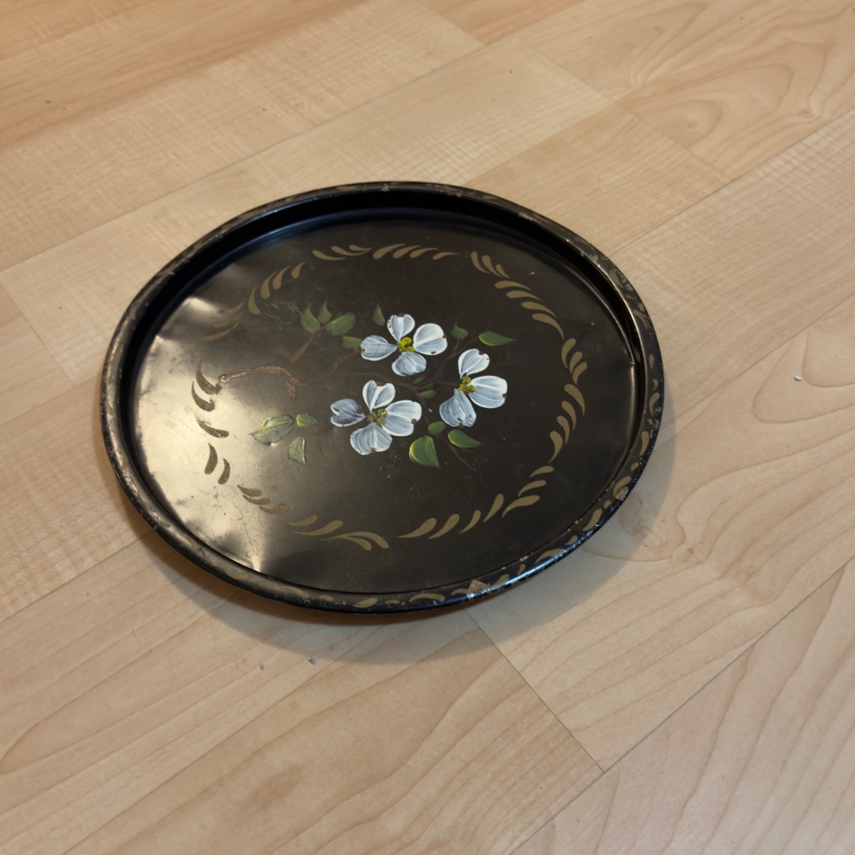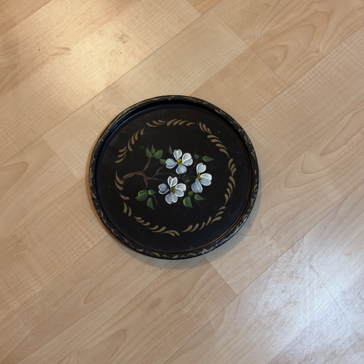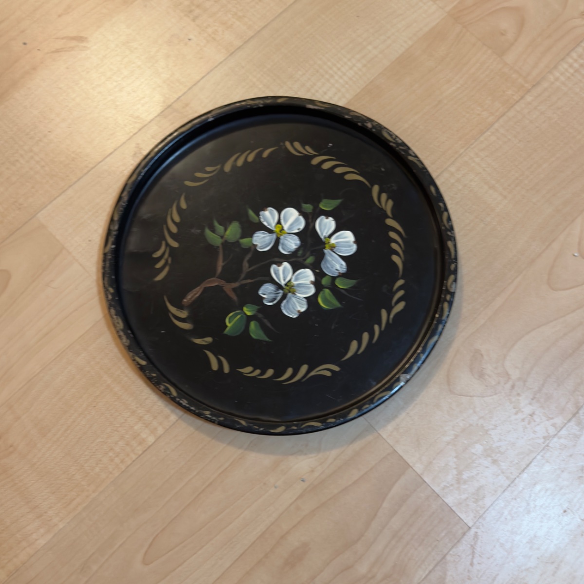 A classic example of American toleware, this round metal tray features hand-painted dogwood blossoms on a 'japanned' black ground.